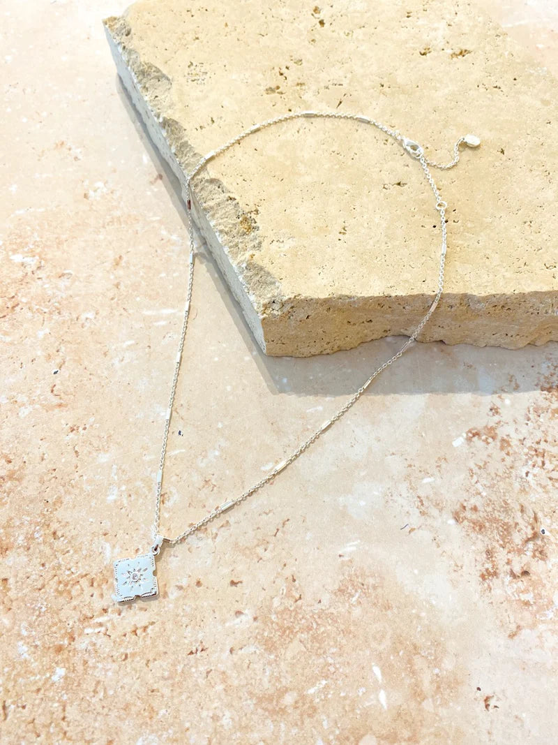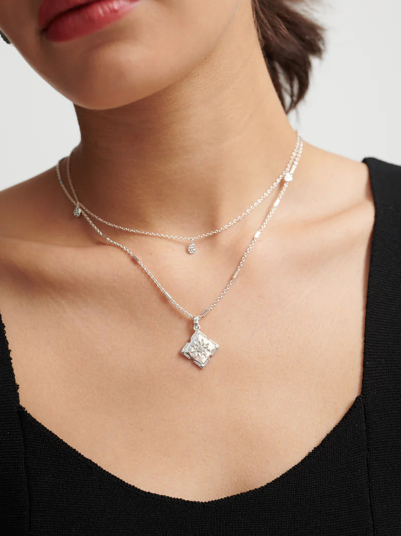 We adore our Mari Necklace. This silver plated charm necklace features a patterned fine chain + pendent with clear stone star design. A new go to chain to finish any look.