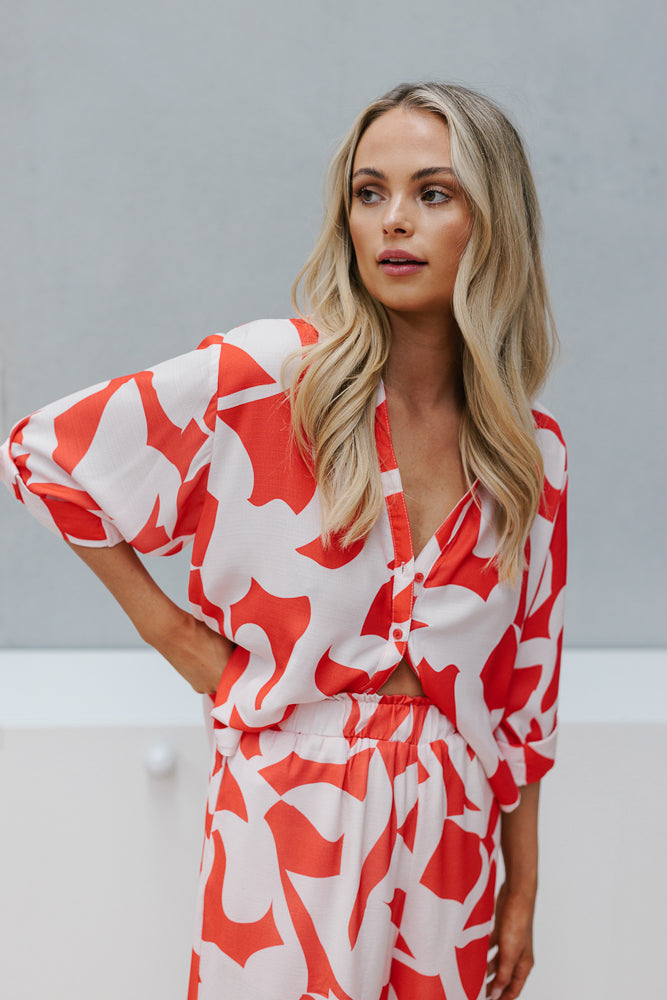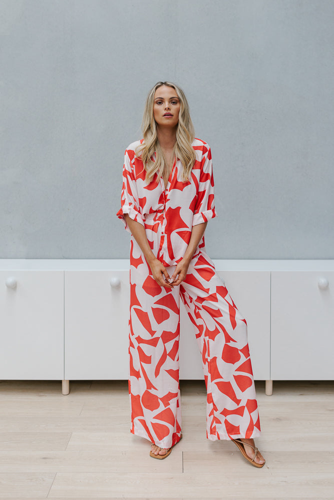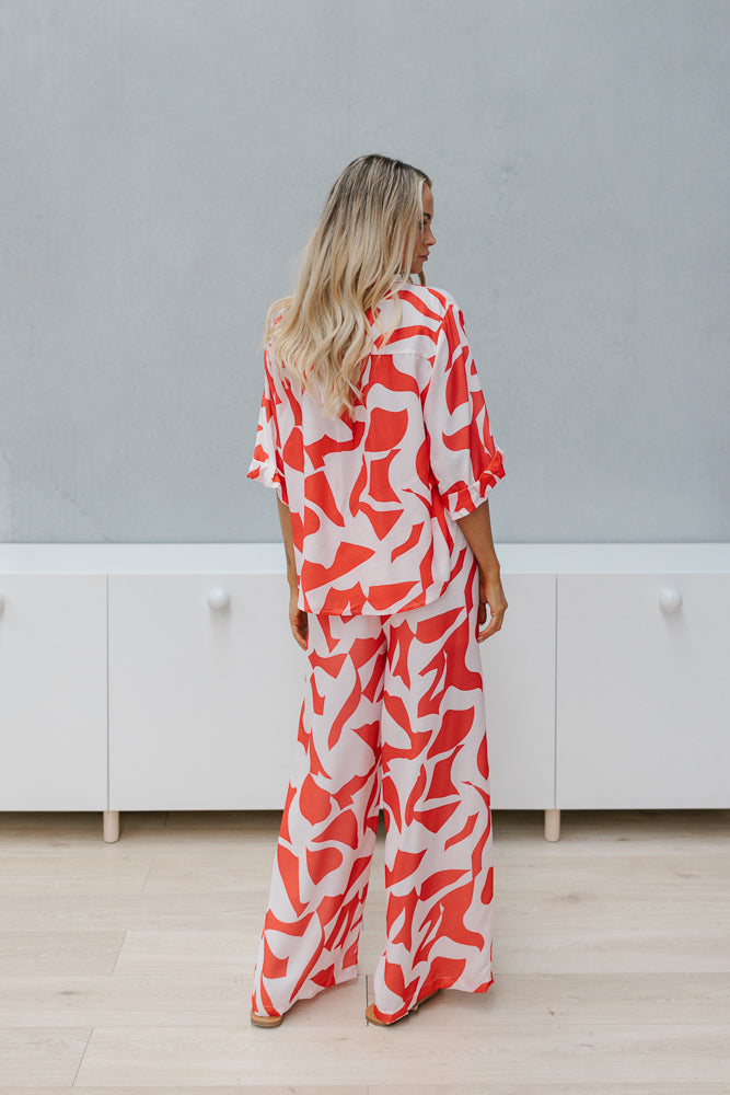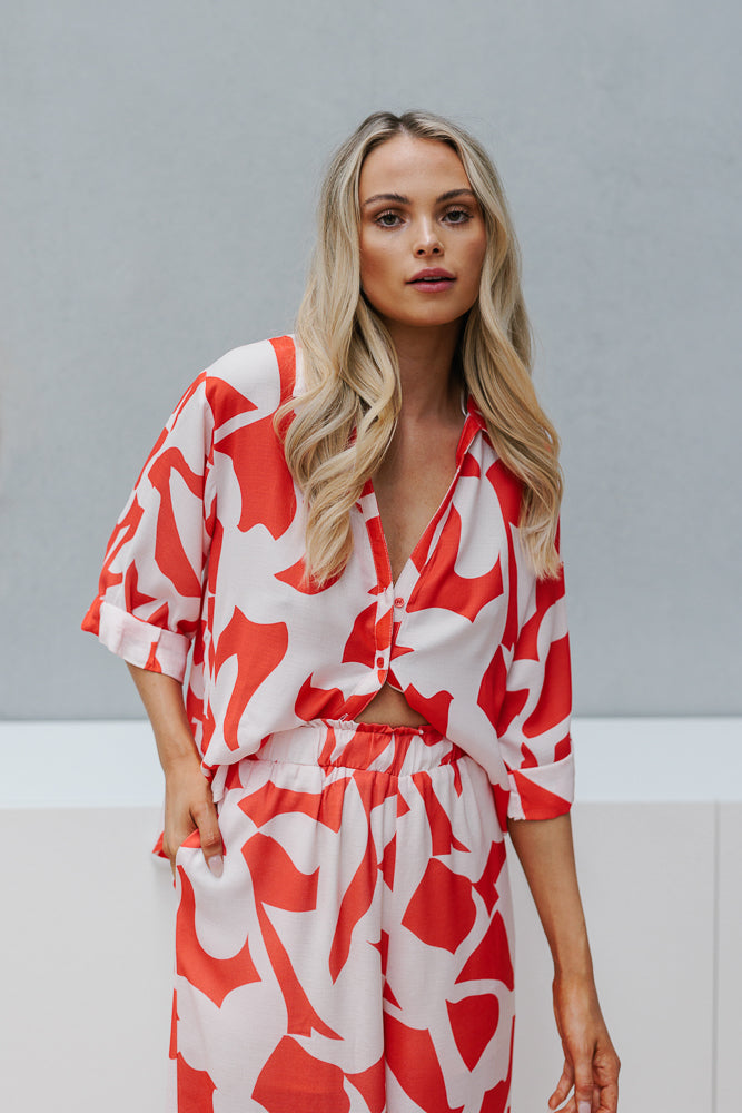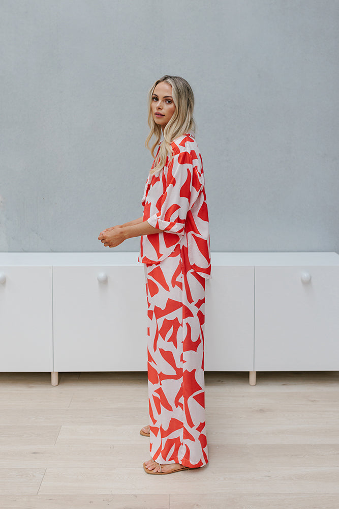 Our Panama Set boasts an exclusive, striking geometric red + cream print. Her boxy shirt pairs with ultra-wide leg pants, providing comfort + flair. Exuding sophistication + style, Panama is perfect for fashion-forward girls after a statement look.