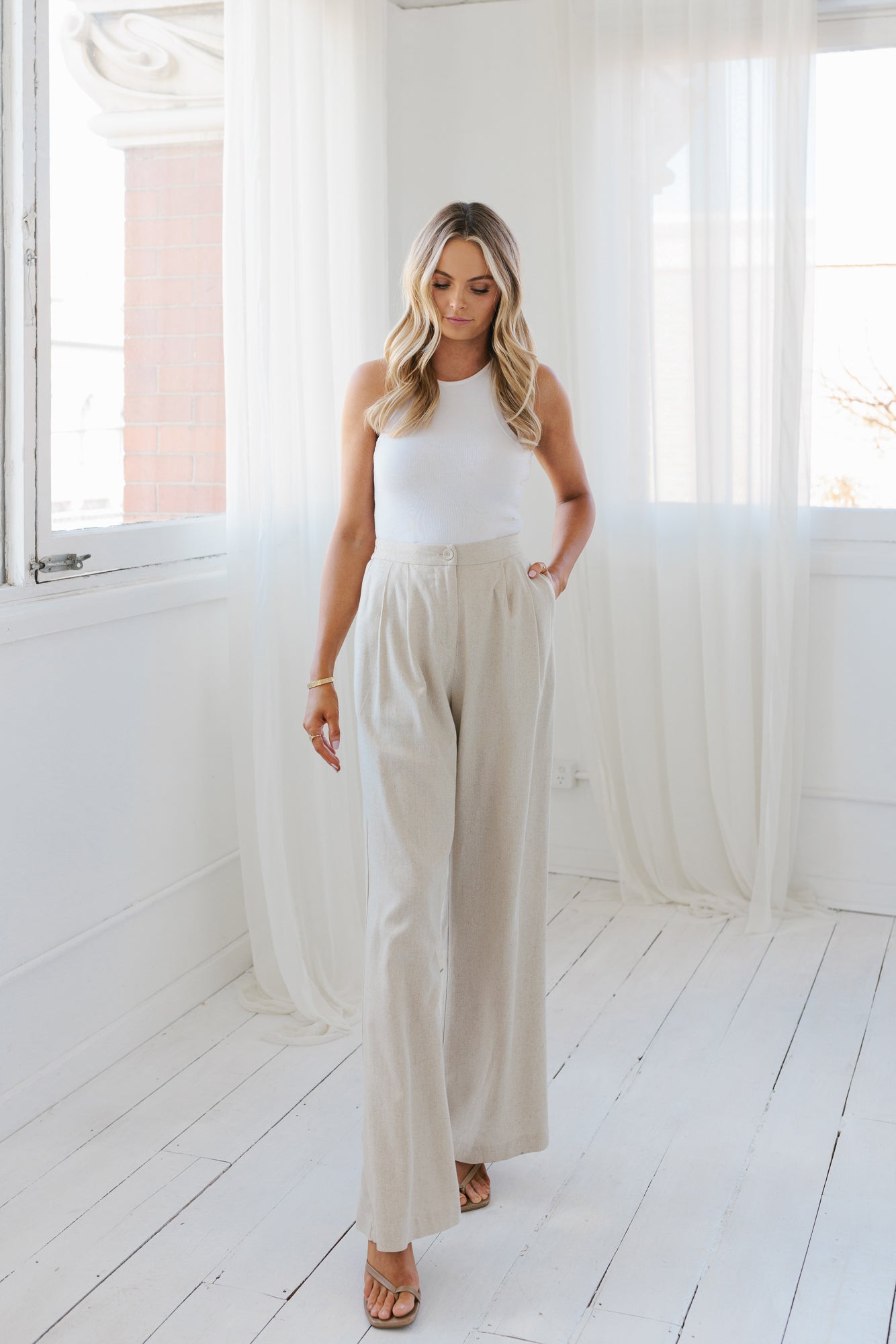 Our Pazzo Pants by BAIA, boast understated refinement + classic style. A flattering, tailored pant offering stretch elastication to back for a modern fit. A timeless oatmeal linen fabrication + wide leg silhouette you will wear time + time again