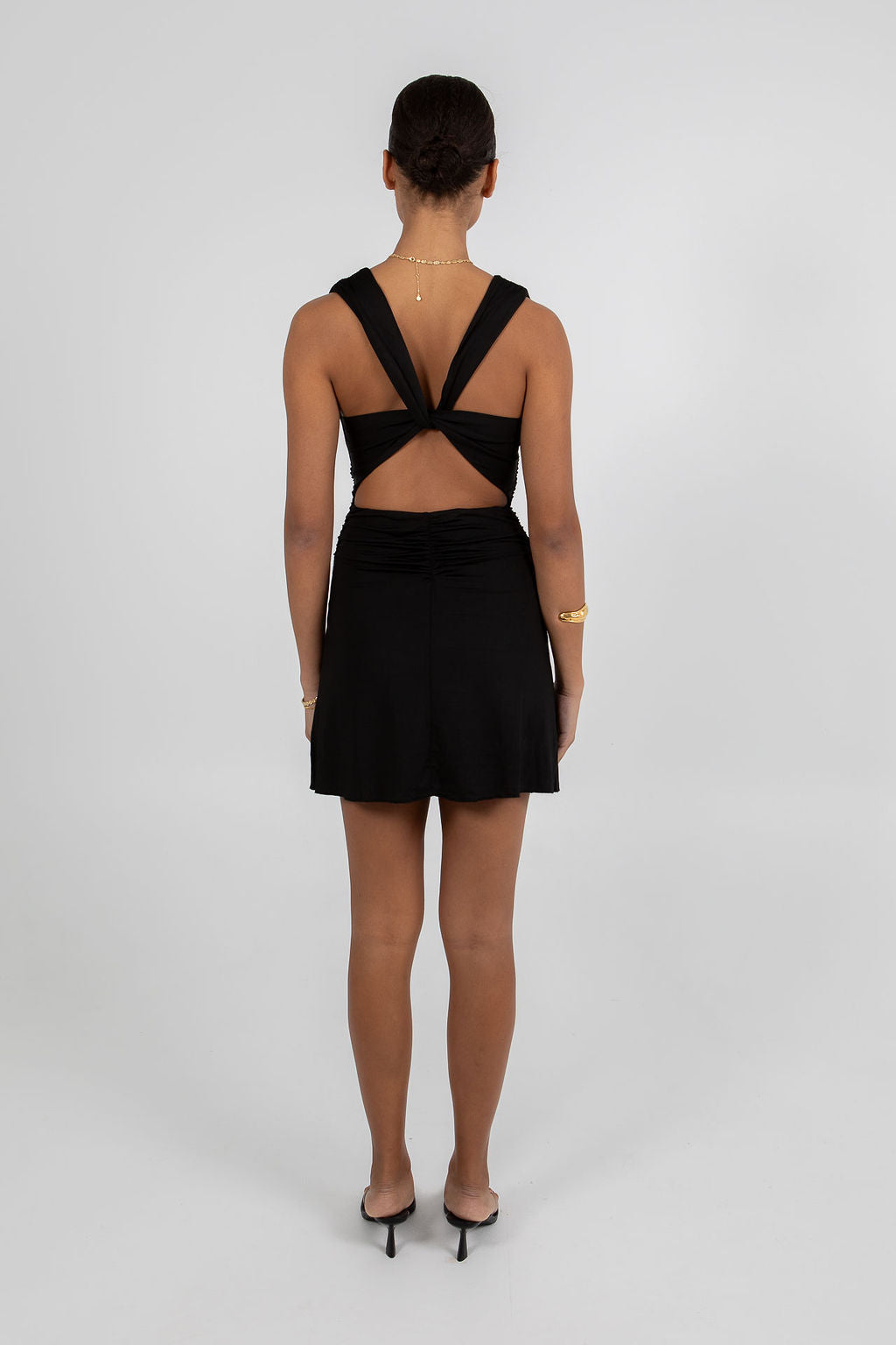The Flossie Dress in black features a flirty cowl neckline and a gorgeous detailed back. Fitted through the body with an A-line silhouette, this mini dress is perfect for nights out, offering effortless style and confident, feminine vibes.
