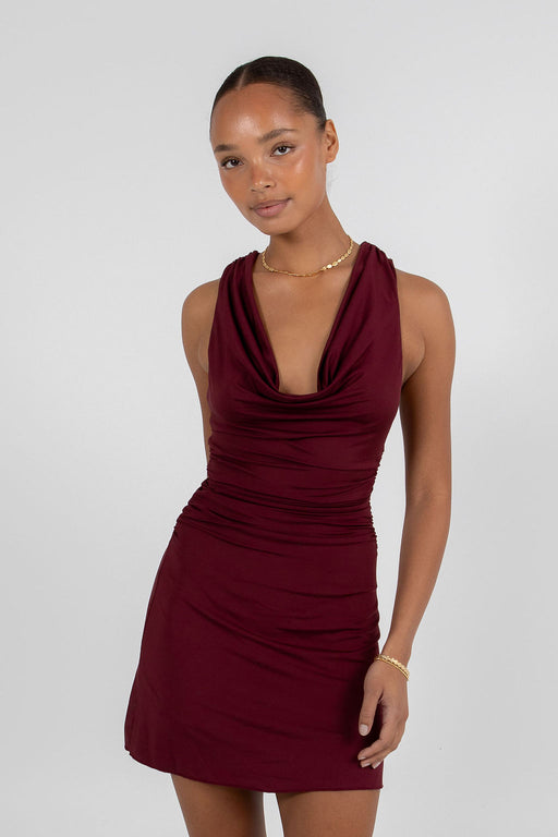 The Flossie Dress in blue features a flirty cowl neckline and a gorgeous detailed back. Fitted through the body with an A-line silhouette, this mini dress is perfect for nights out, offering effortless style and confident, feminine vibes.