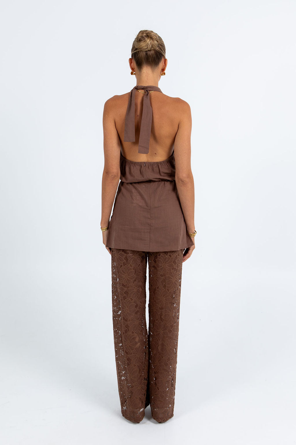 The Honor Set exudes sophistication with chocolate brown lace pants and a halter top featuring a flowing longer length and elegant cowl neckline. Perfectly balanced between modern edge and refined style for effortless day to night looks.
