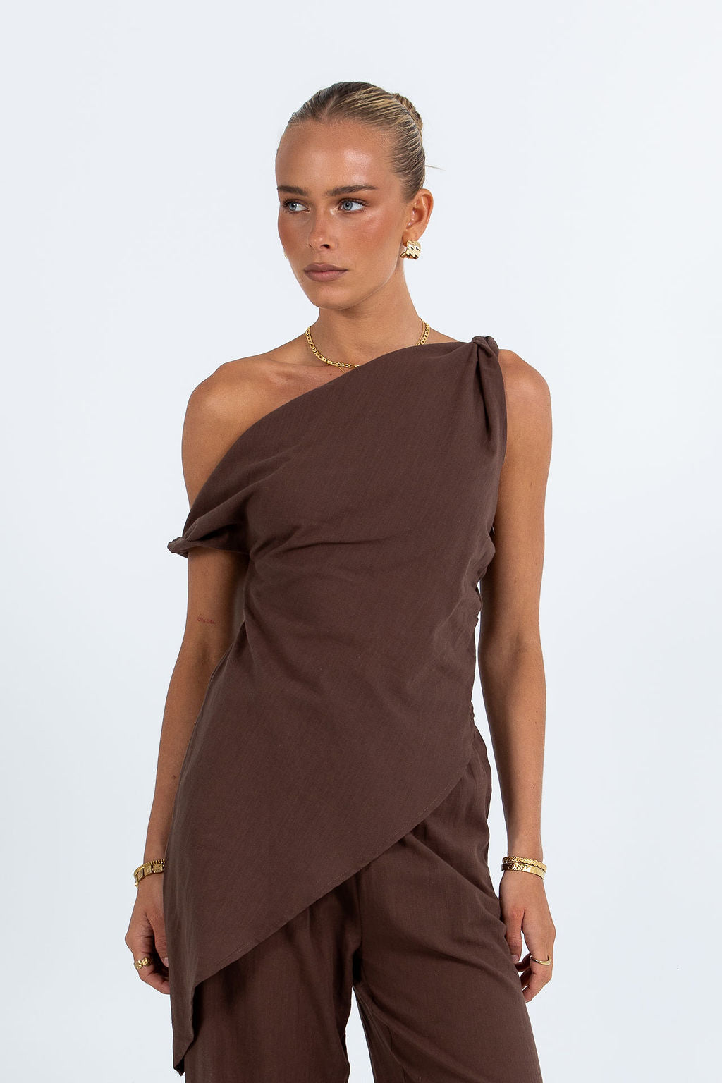 The Jovanna Set in rich chocolate pairs an asymmetrical top with relaxed, loose-fitting pants. Effortlessly stylish and modern, she’s perfect for turning heads from casual days to evening outings with minimal effort.
