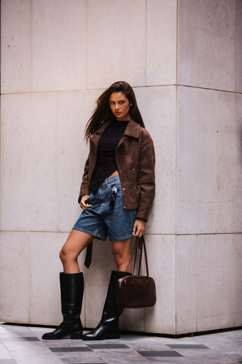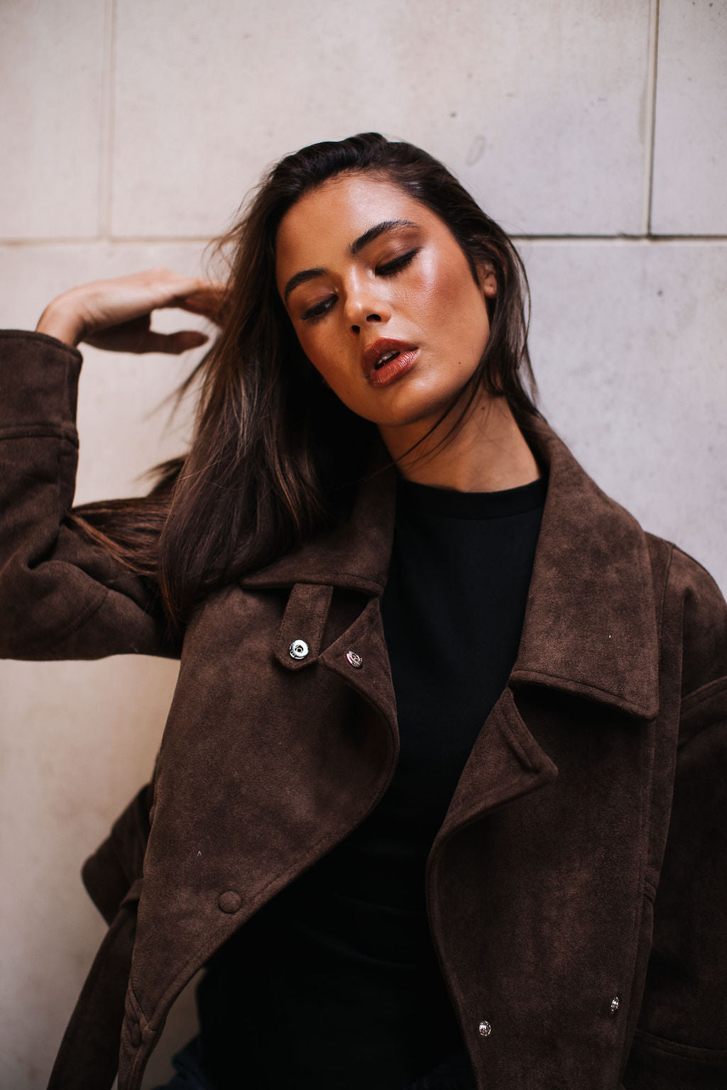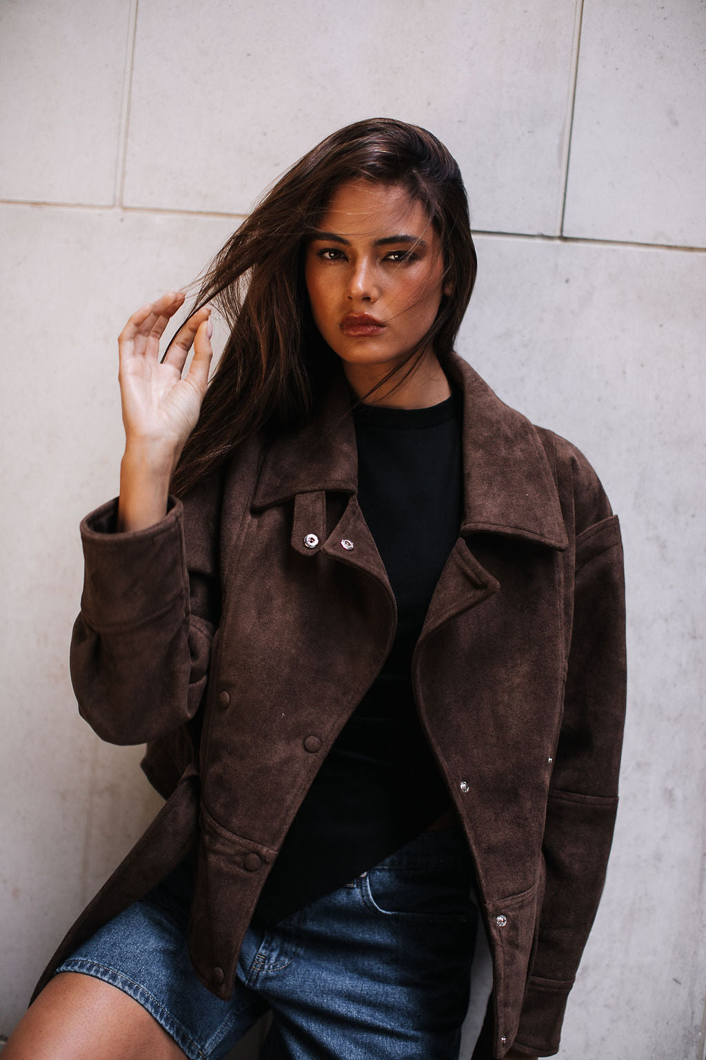 A chic cropped jacket! in soft suede look fabric, featuring a structured collar, snap button front, and waist tie for a flattering silhouette. Its neutral chocolate tone makes it perfect for layering, adding warmth and effortless style to any outfit