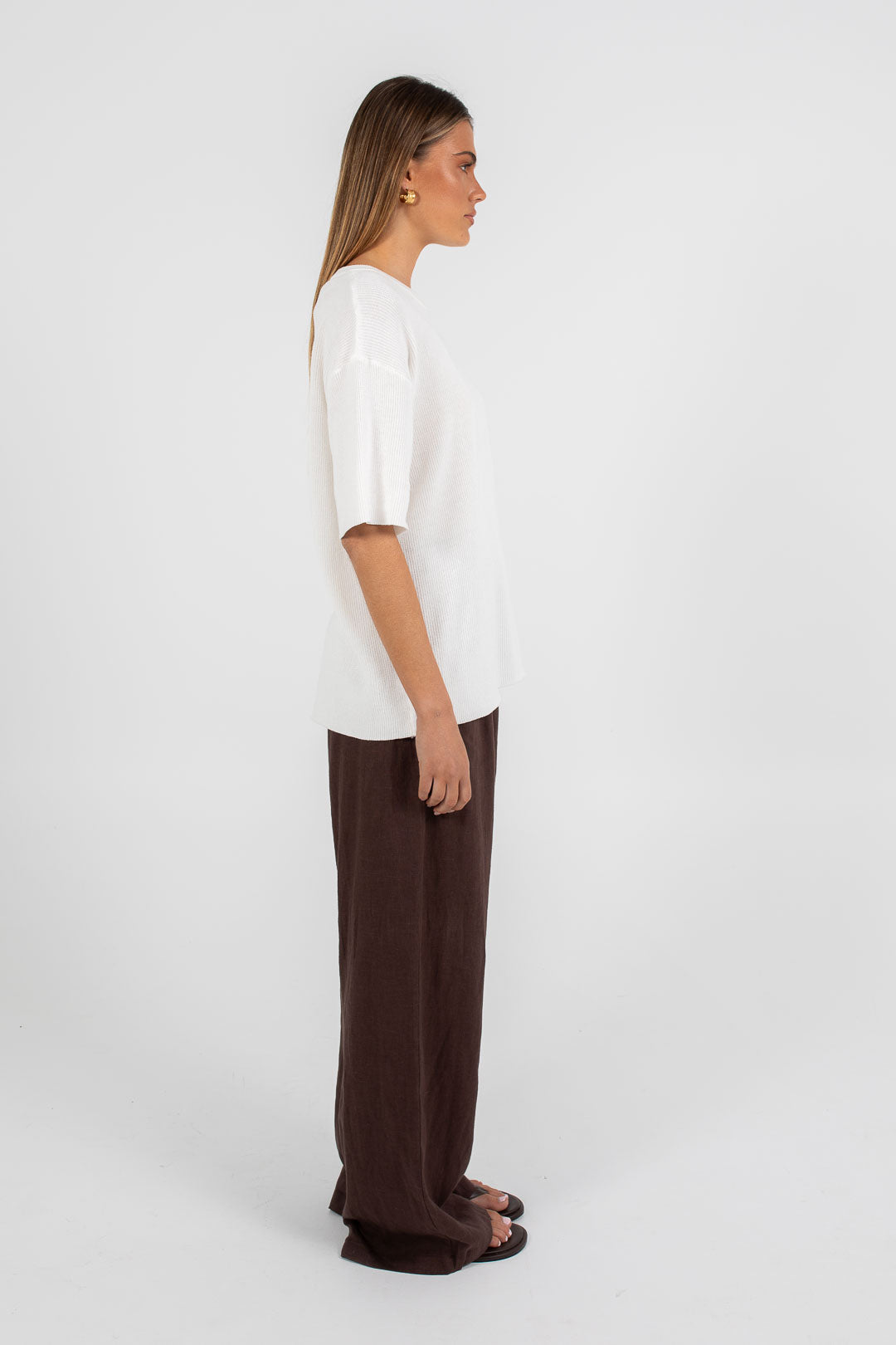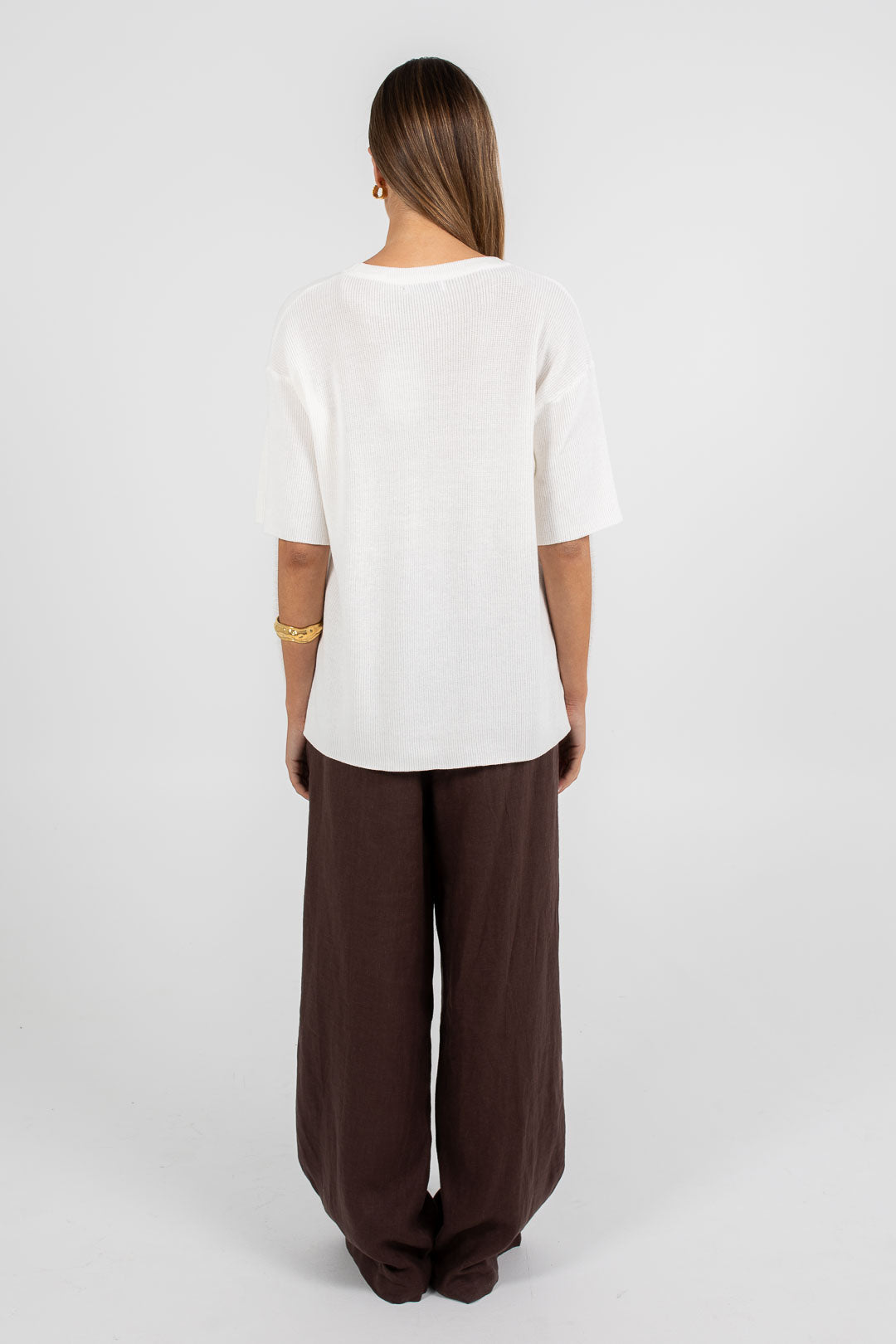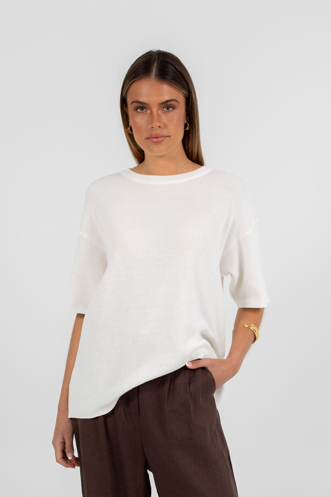 The Destiny Top in white is a staple piece crafted from ribbed cotton fabric, designed for everyday wear. Its timeless style and oversized fit make it the perfect piece to style effortlessly with any outfit, blending comfort and chic simplicity.