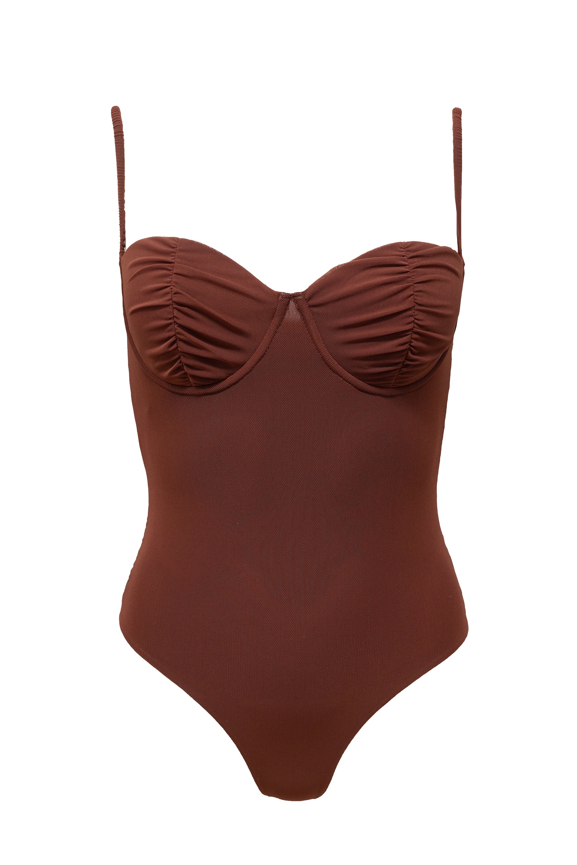 Exclusive style to MMB. Structured, rich chocolate brown mesh bodysuit with ruched cups.