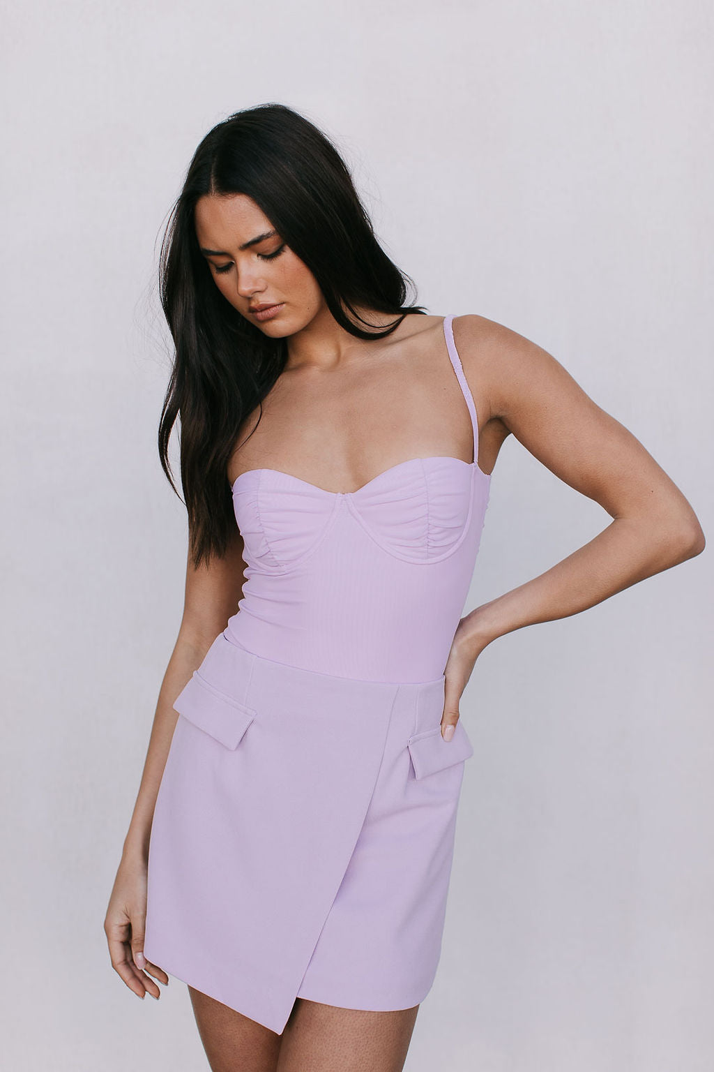 Exclusive style to MMB. Structured pastel lilac mesh bodysuit with ruched cups.