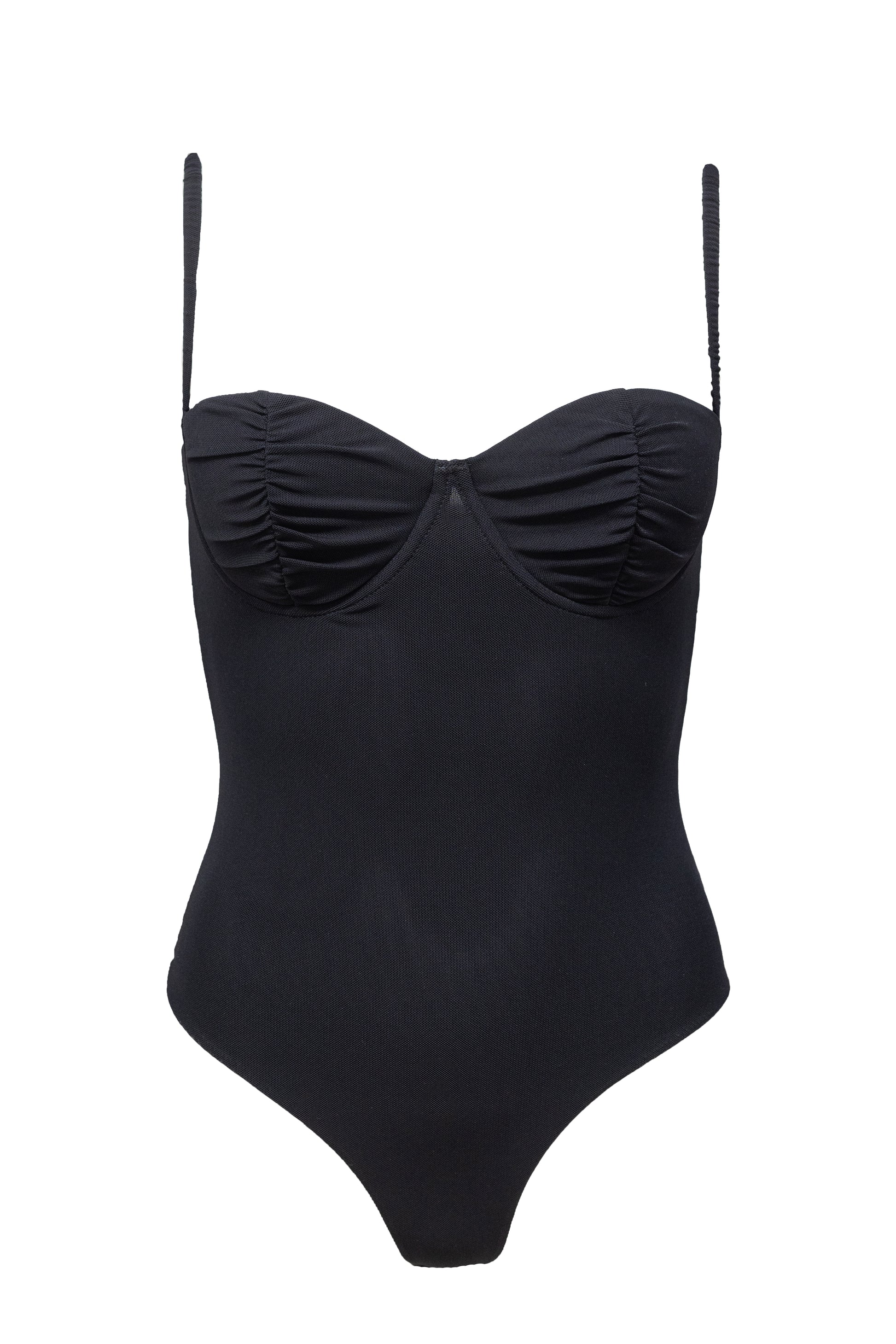 Exclusive style to MMB. Structured black mesh bodysuit with ruched cups.