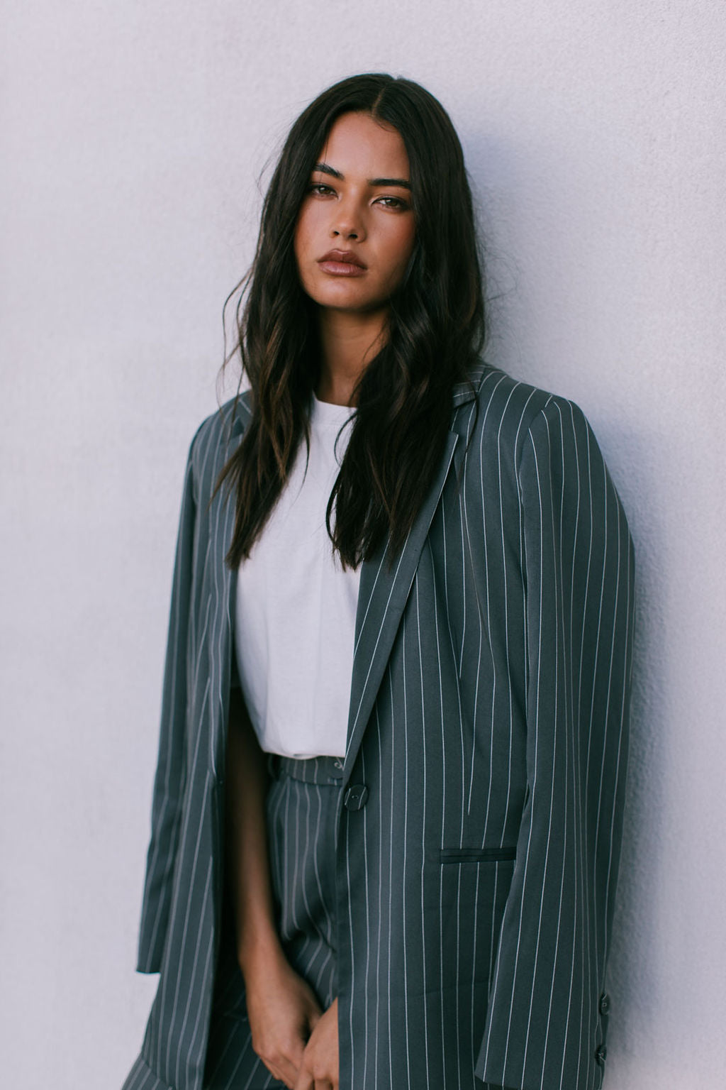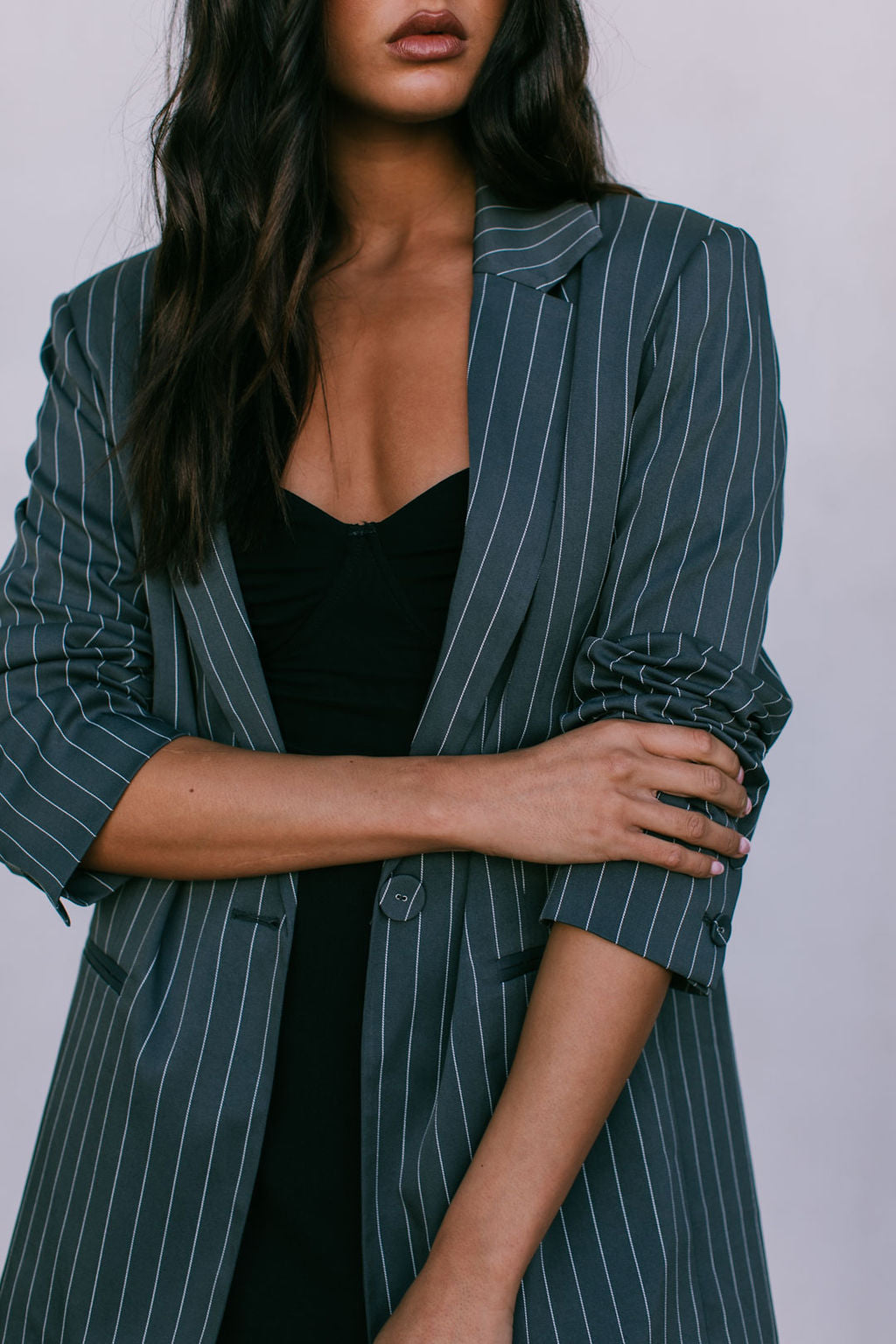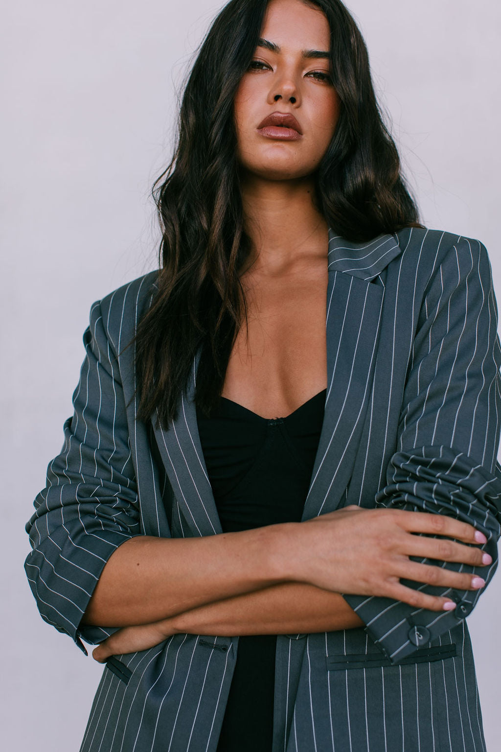 Elevate your style in our Quade Blazer, exclusive to MMB. This relaxed tailored blazer in charcoal grey boasts classic white pinstripes + luxe details. Versatile to style solo in your wardrobe or pair with our Cerlah Pants for the ultimate set.