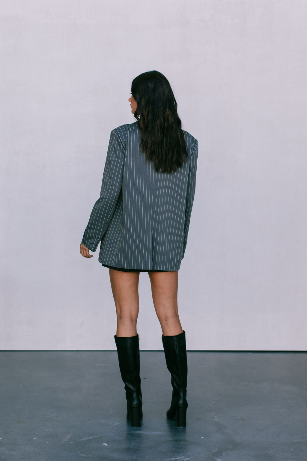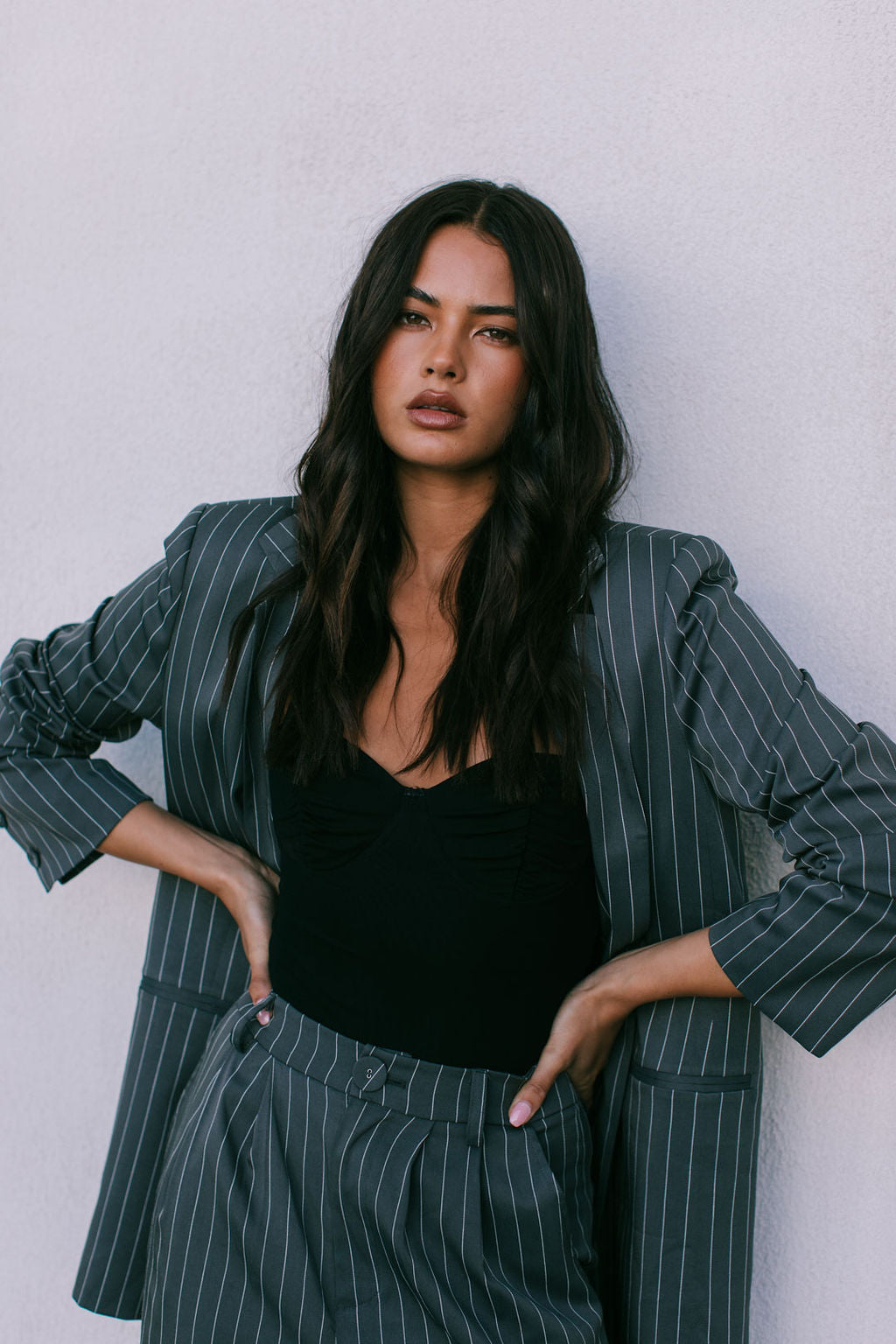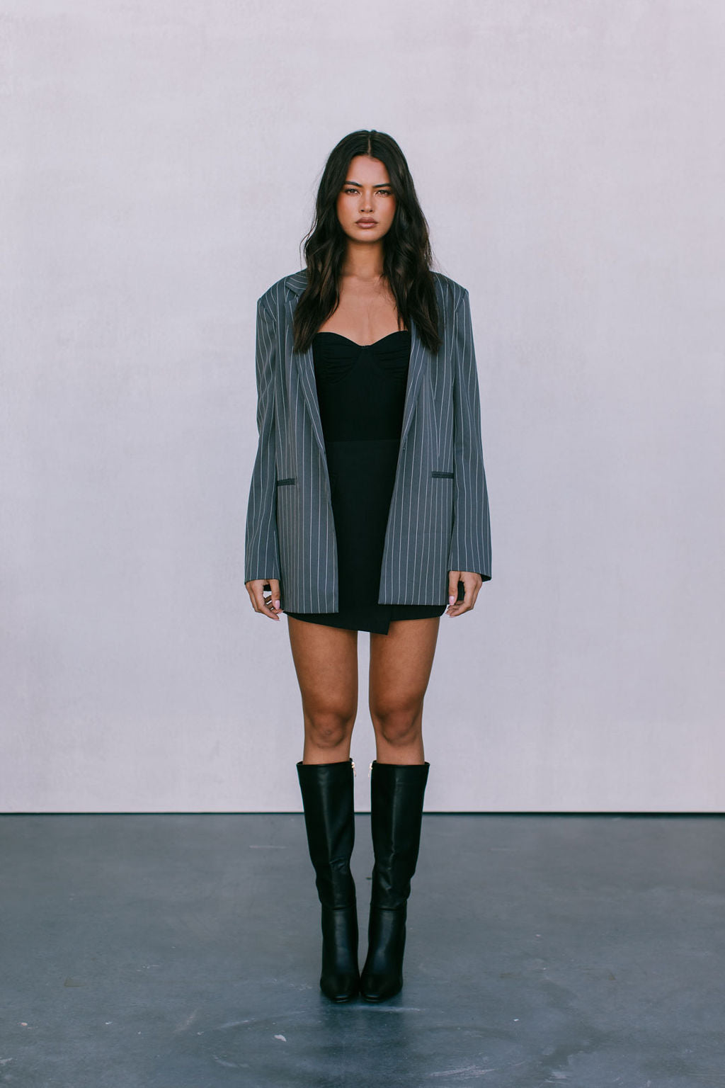 Elevate your style in our Quade Blazer, exclusive to MMB. This relaxed tailored blazer in charcoal grey boasts classic white pinstripes + luxe details. Versatile to style solo in your wardrobe or pair with our Cerlah Pants for the ultimate set.