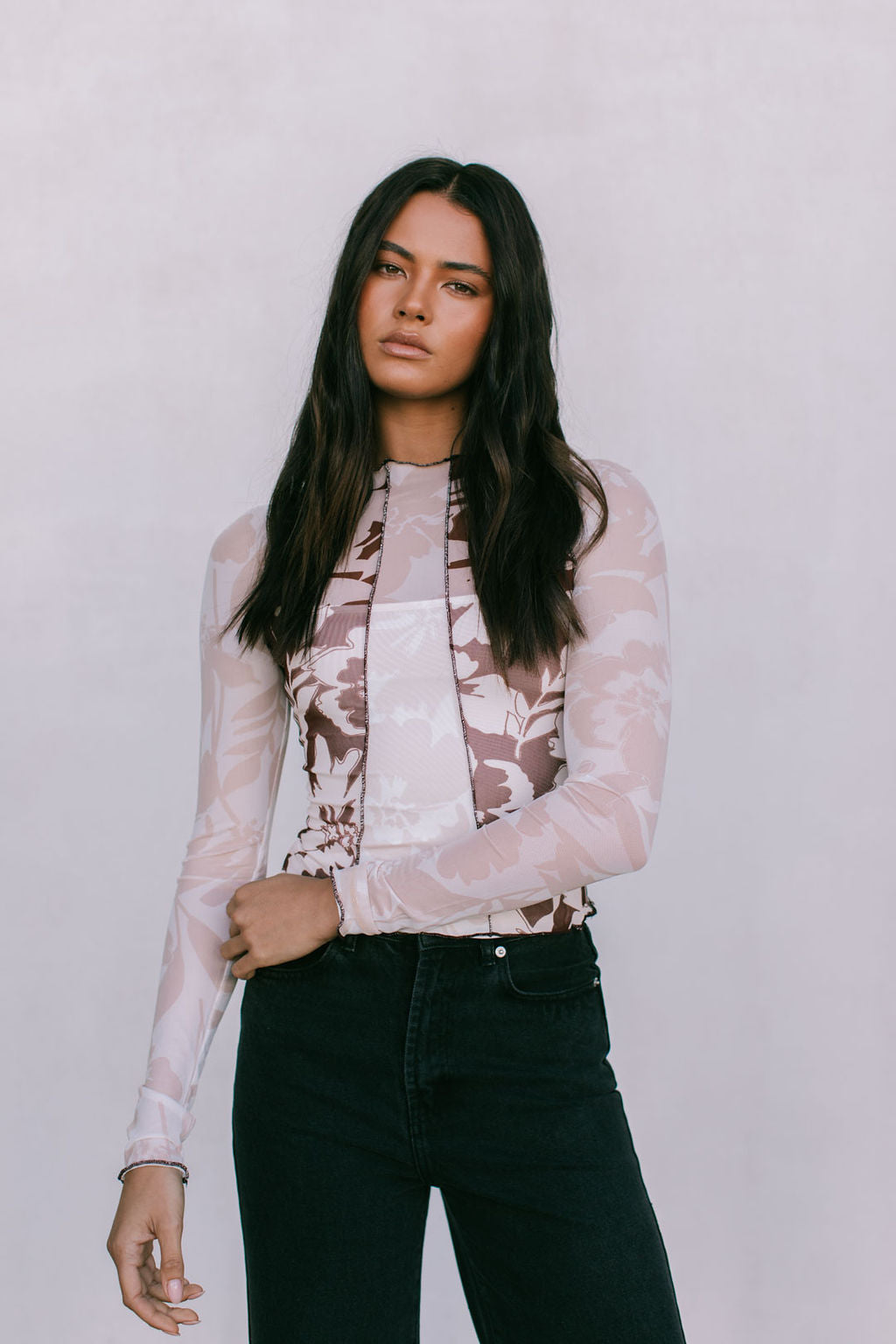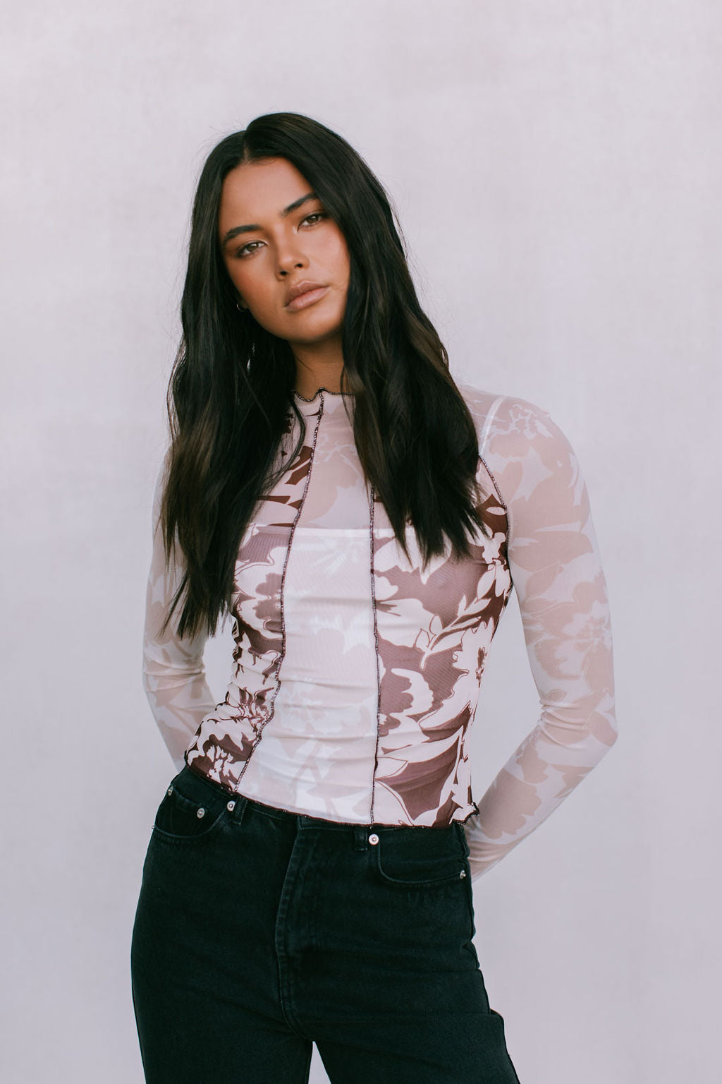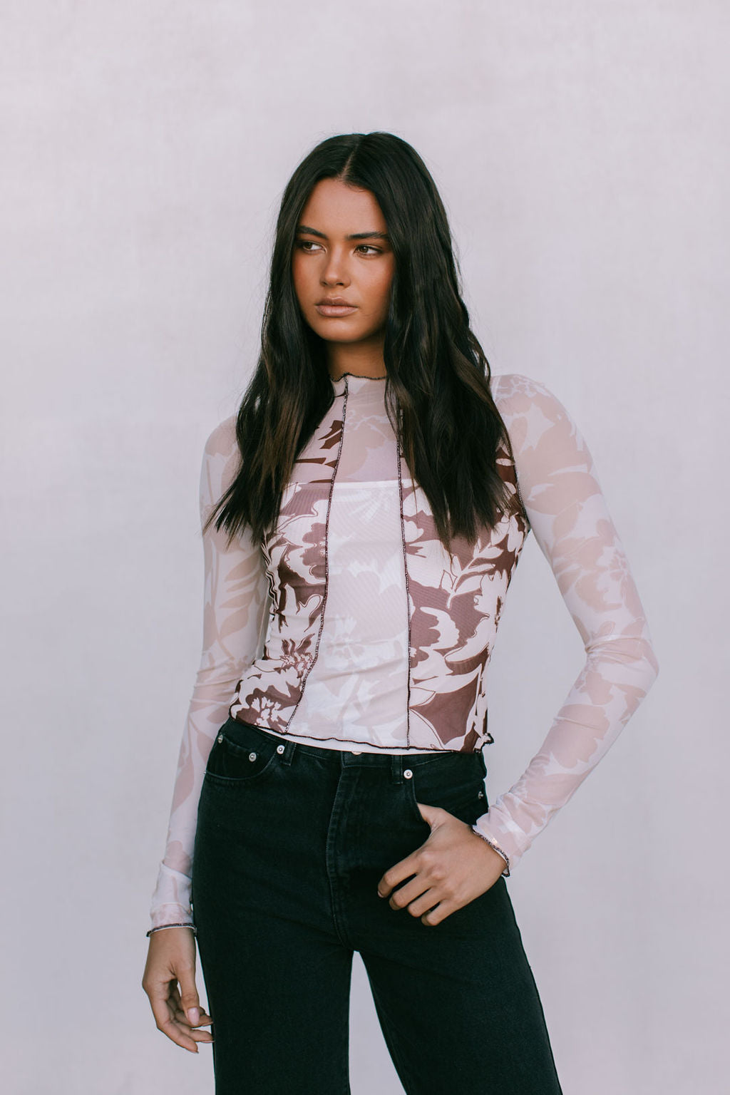 Turn heads in our Quays Top, a sheer mesh top in a beige + chocolate floral print. With exposed seams, contrast panels + a high funnel neck, she is equal parts bold + refined. Style with denim for the perfect dinner date fit.