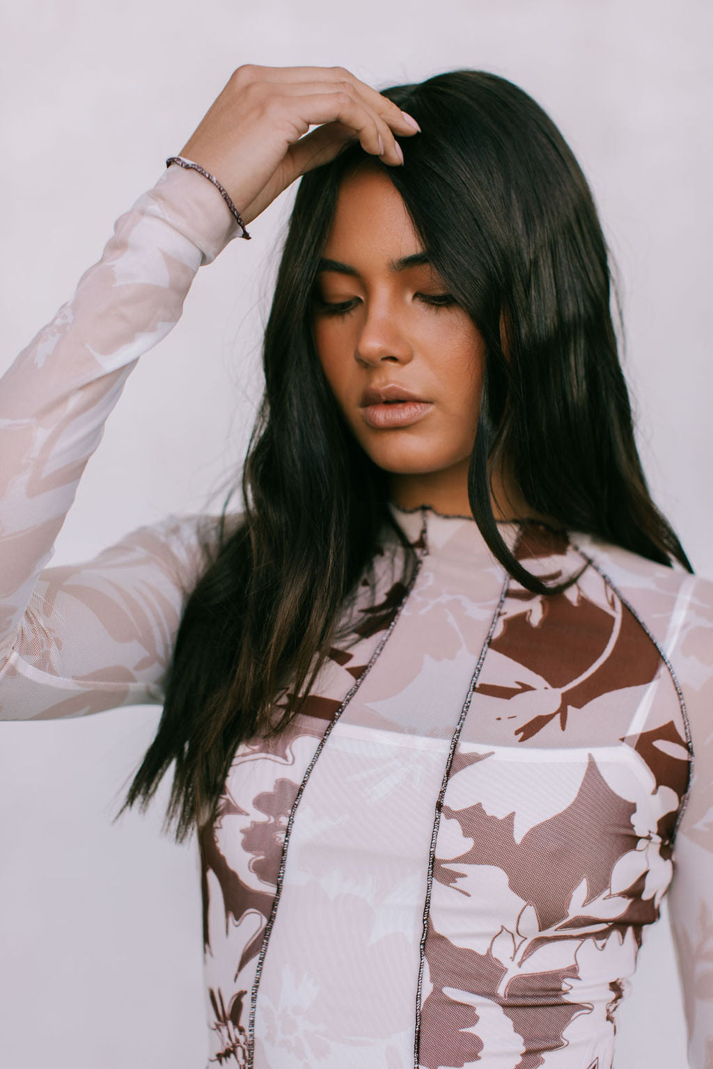 Quays Long-sleeve Top - Beige/Chocolate Brown Floral Mesh