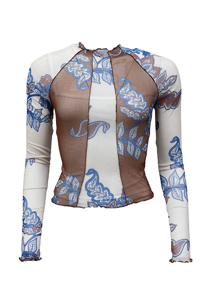 Beautiful chocolate, cream + blue paisley printed contrast panel mesh top