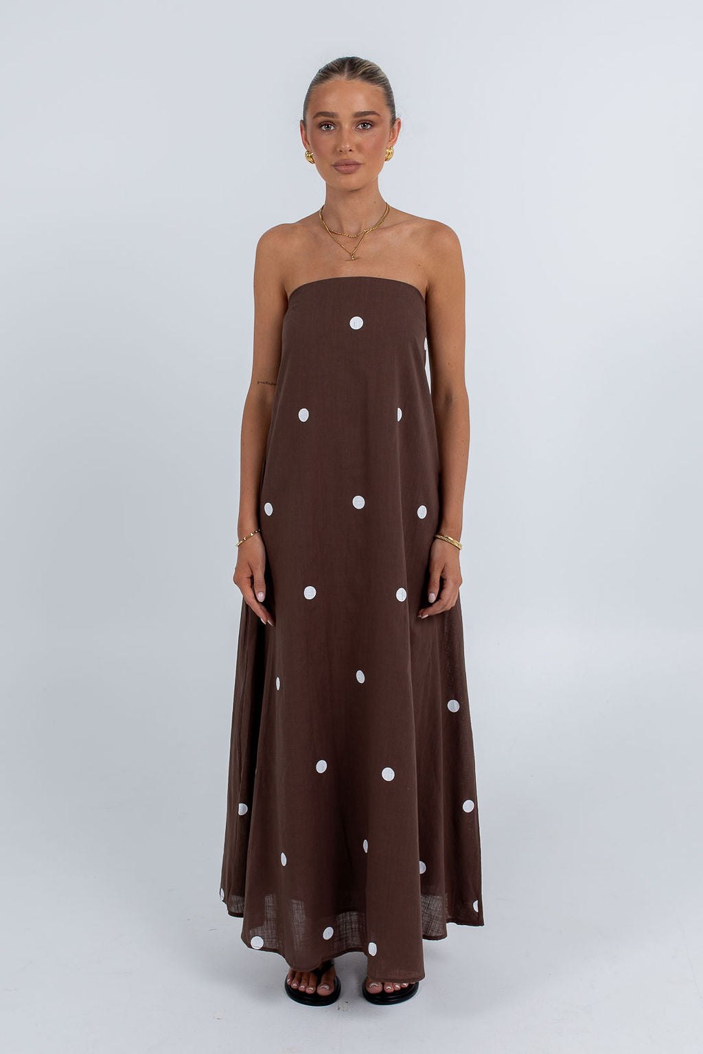 The Quella Maxi Dress in chocolate with white polka dots features a strapless design and a flowy bodice for effortless elegance. Its maxi length creates a dramatic, feminine silhouette, perfect for summer days, garden parties, or evening events.