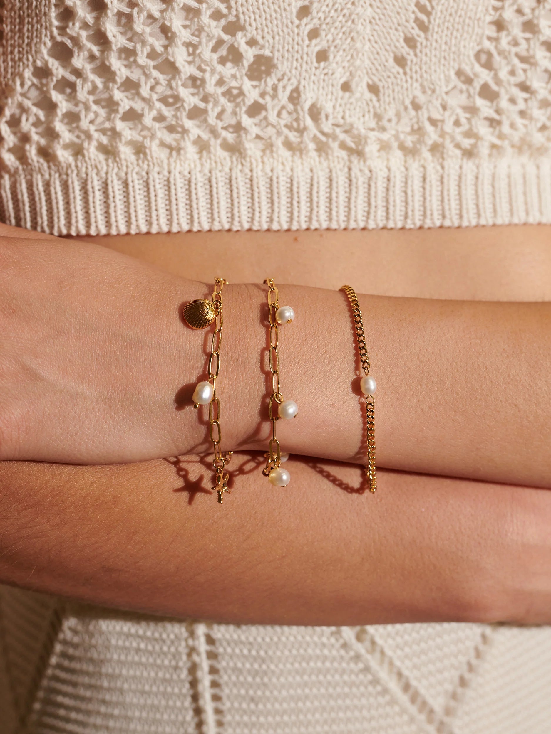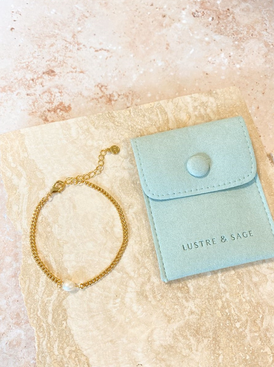 Our Rhoda Pearl Bracelet, is part of the Lustre & Sage collection ~ features dainty & timeless 18K gold plated pieces perfect for everyday wear. We love styled for summer soirées, especially as the finishing touch to any beautiful white dress!