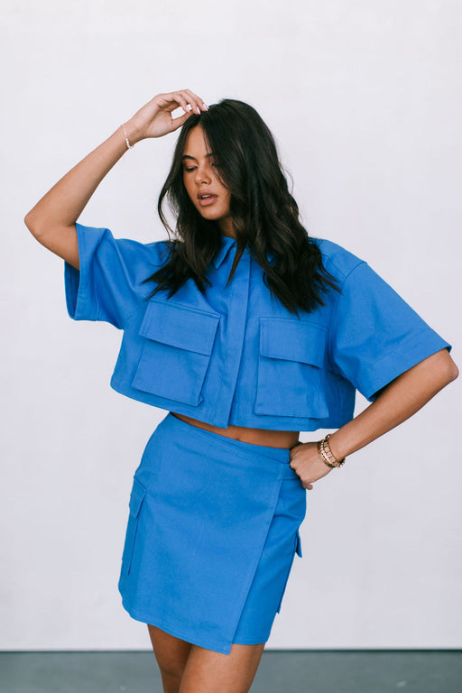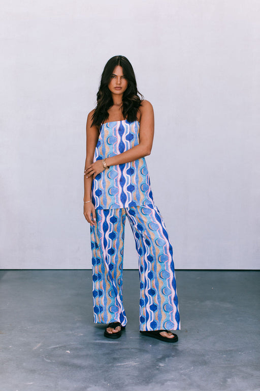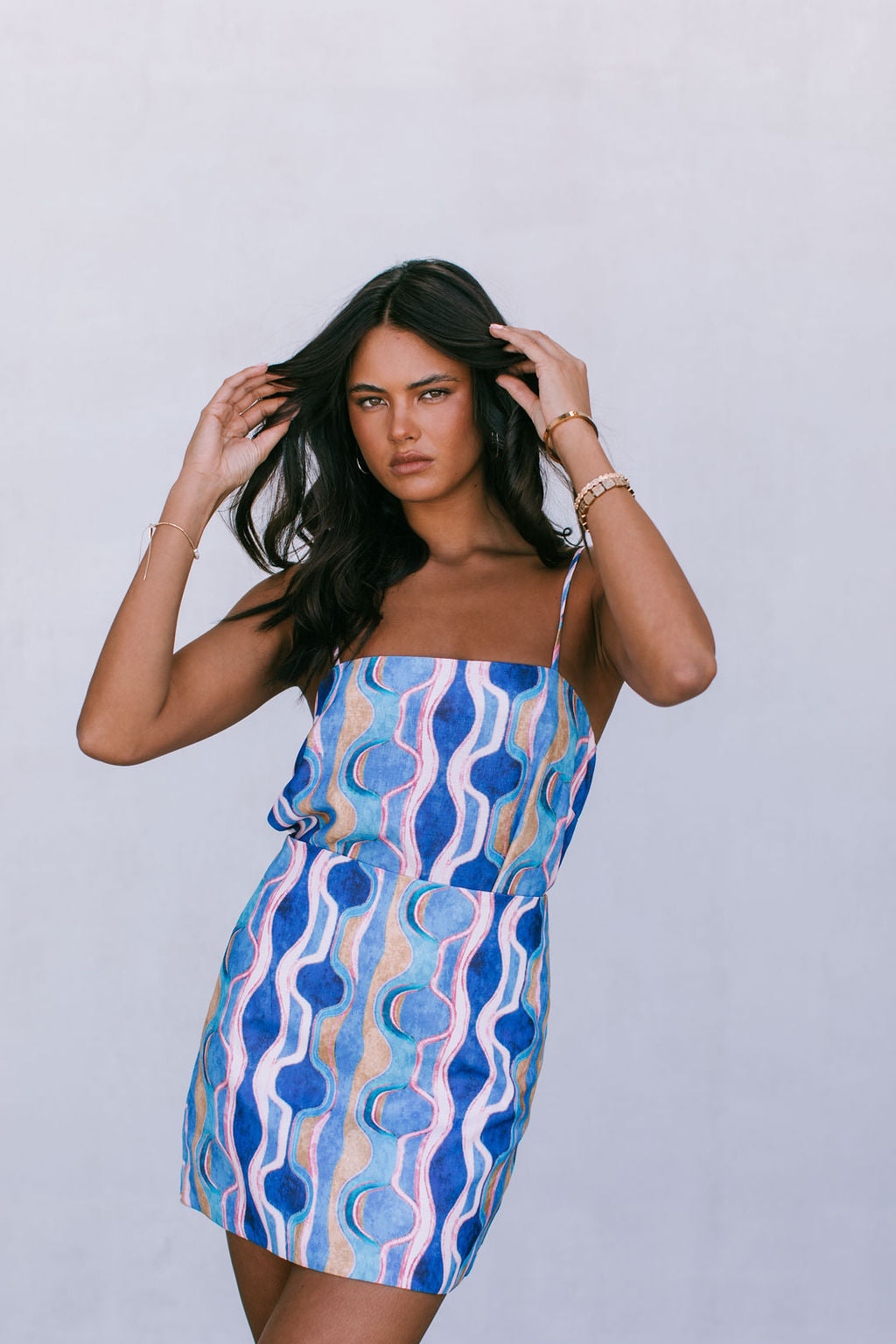 Meet our Rhodes Skirt by Zella The Label. This bold mini boasts a stunning water colour print in Blue, Tan + Pink tones. Her classic silhouette offers a chic yet versatile style. Pair with our matching Larnia Singlet, Apella Top, or Corfu Shirt.