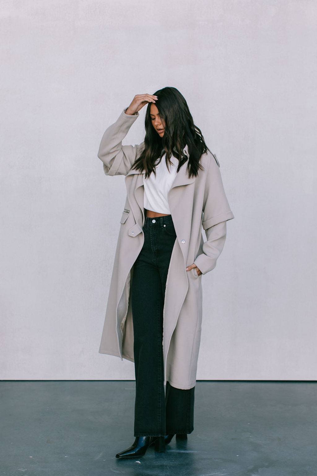 Make a statement in our Sarah Trench Coat. In a versatile stone grey hue, this relaxed trench boasts effortless style. Switch between full-length + short sleeves, she is the ultimate versatile coat for trans-seasonal dressing + layering.