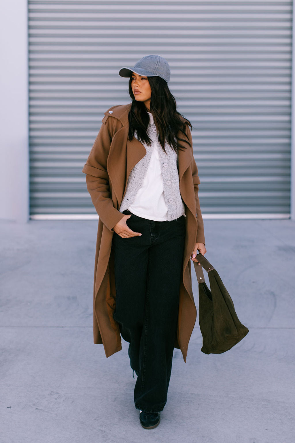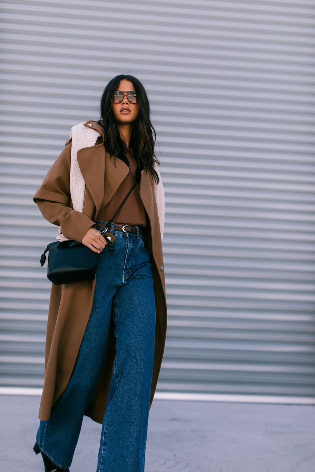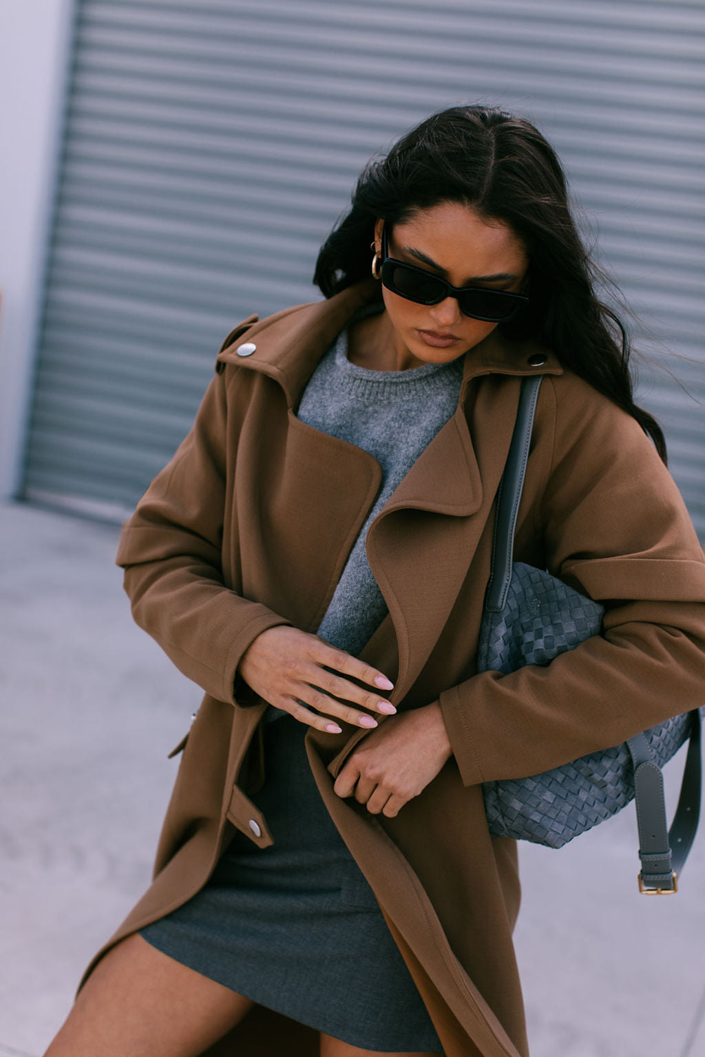 Warm toffee brown trench coat women. Ultra, oversized silhouette.