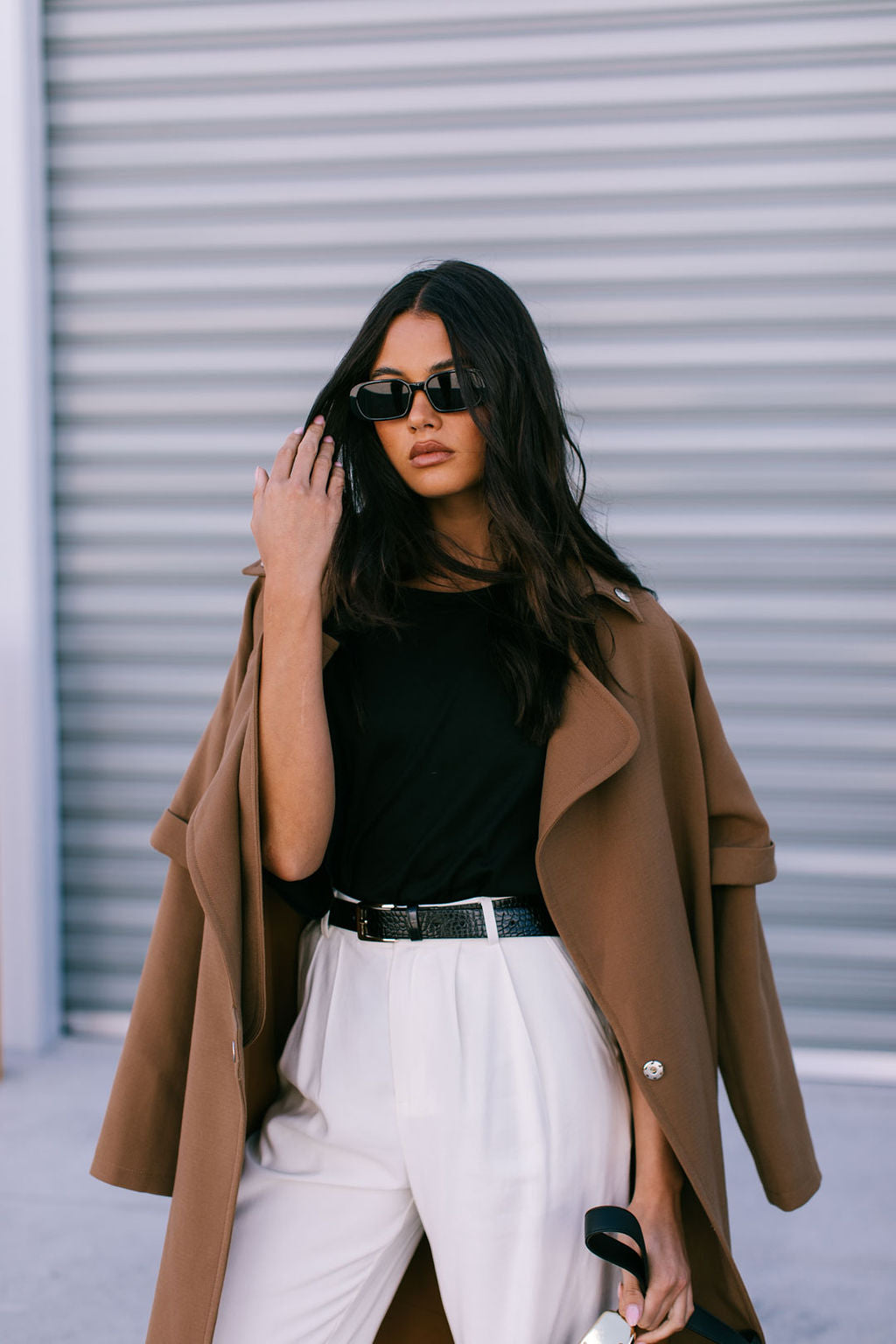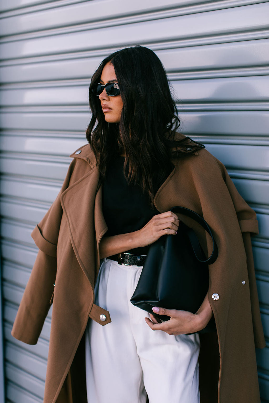 Make a statement in the Sarah Trench Coat. In a neutral toffee brown, this relaxed trench boasts effortless style. Switch between full-length + short sleeves, it is the ultimate versatile coat for trans-seasonal dressing + layering.
