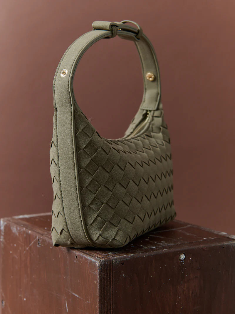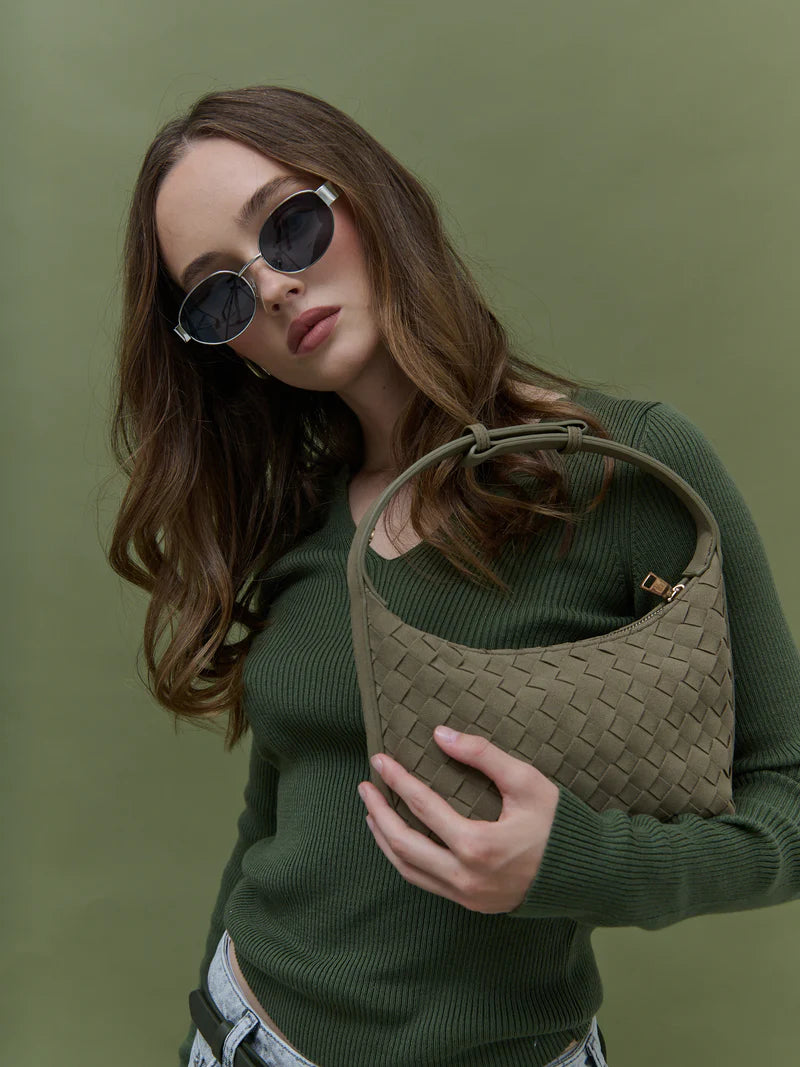 Our Cleo Bag blends elegance + practicality with its woven texture + luxe vegan suede finish. Boasting a versatile khaki green hue + gold hardware, this chic handbag is perfect for elevating any outfit with timeless style.