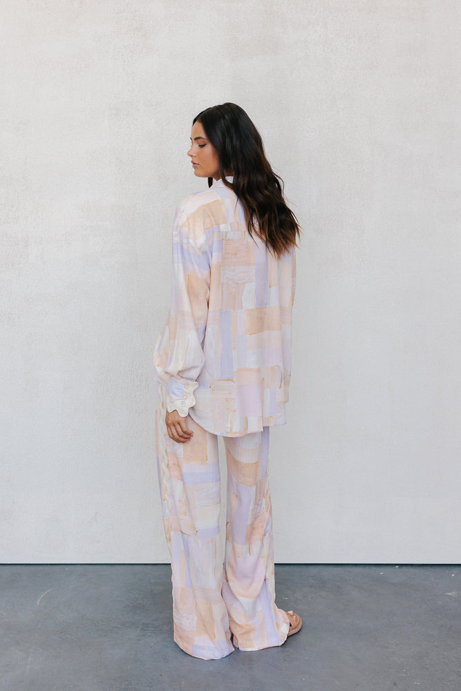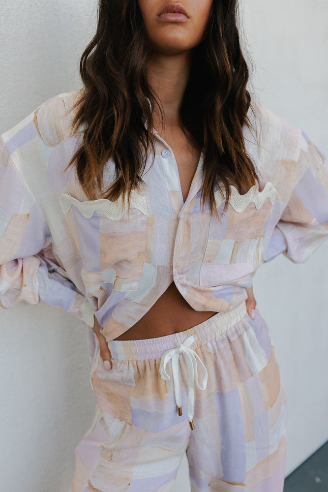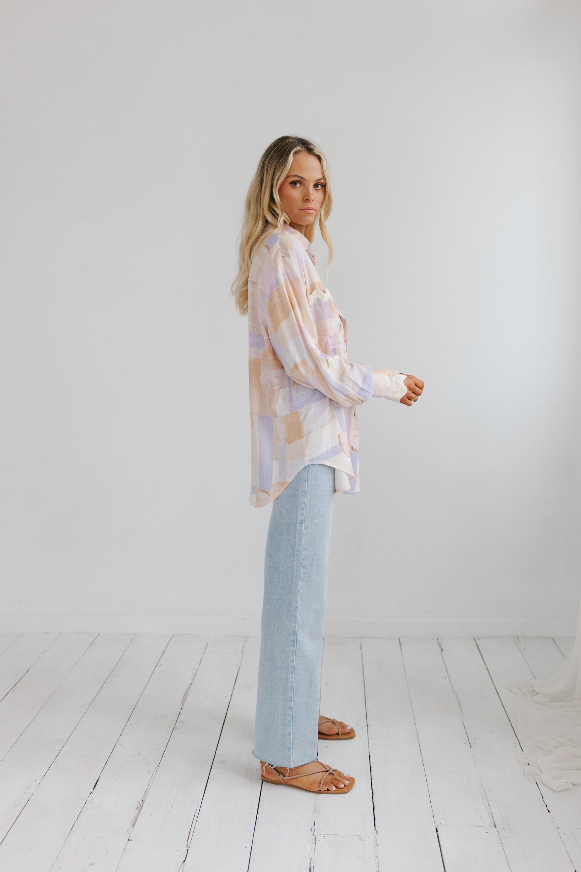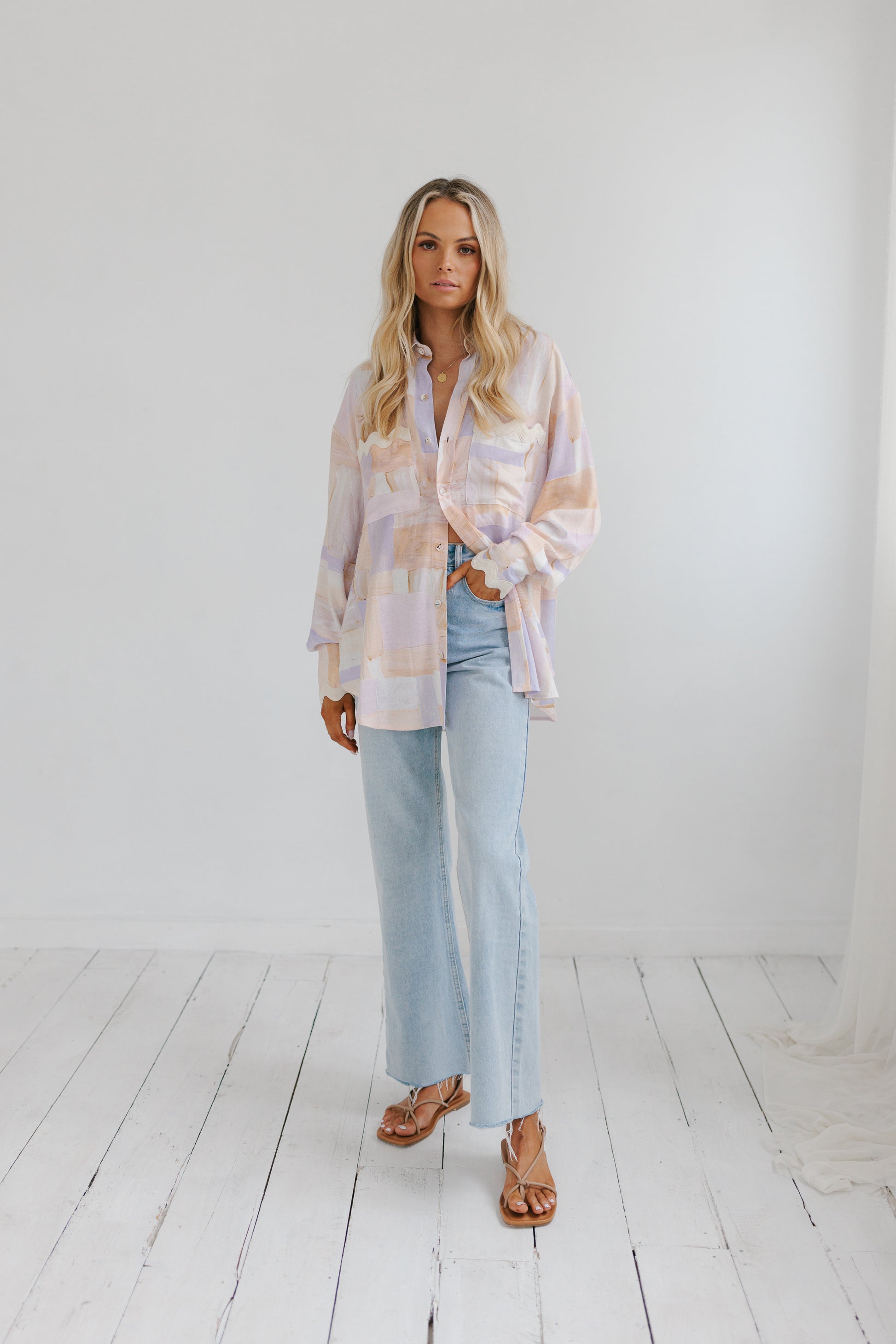 Stunning peach, pink + lilac hued exclusive artist print linen blend shirt