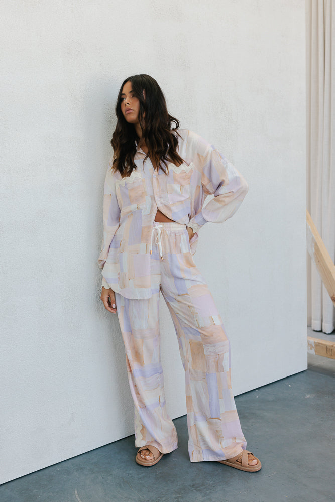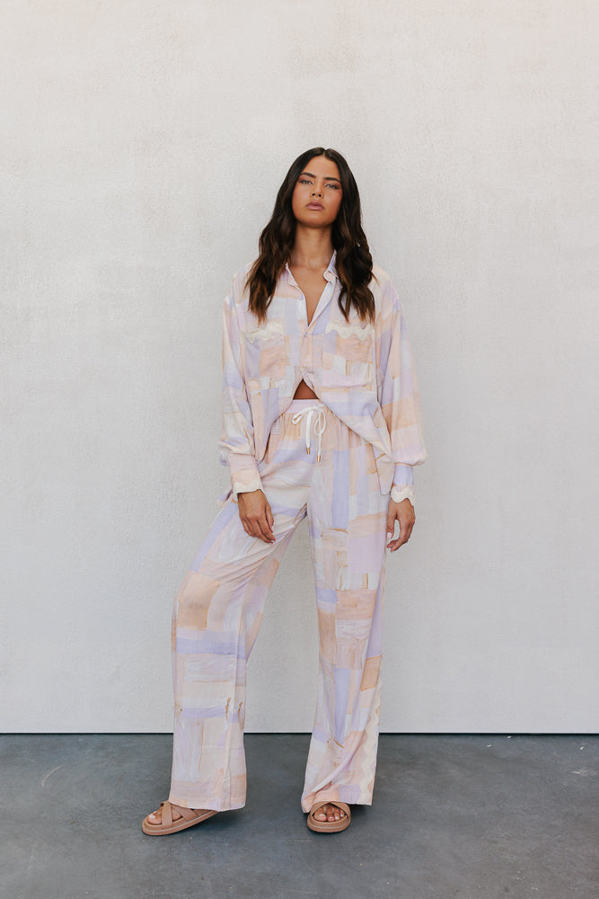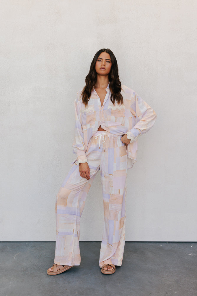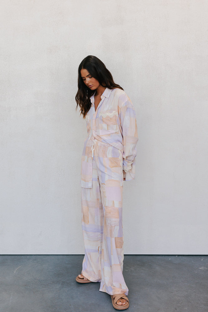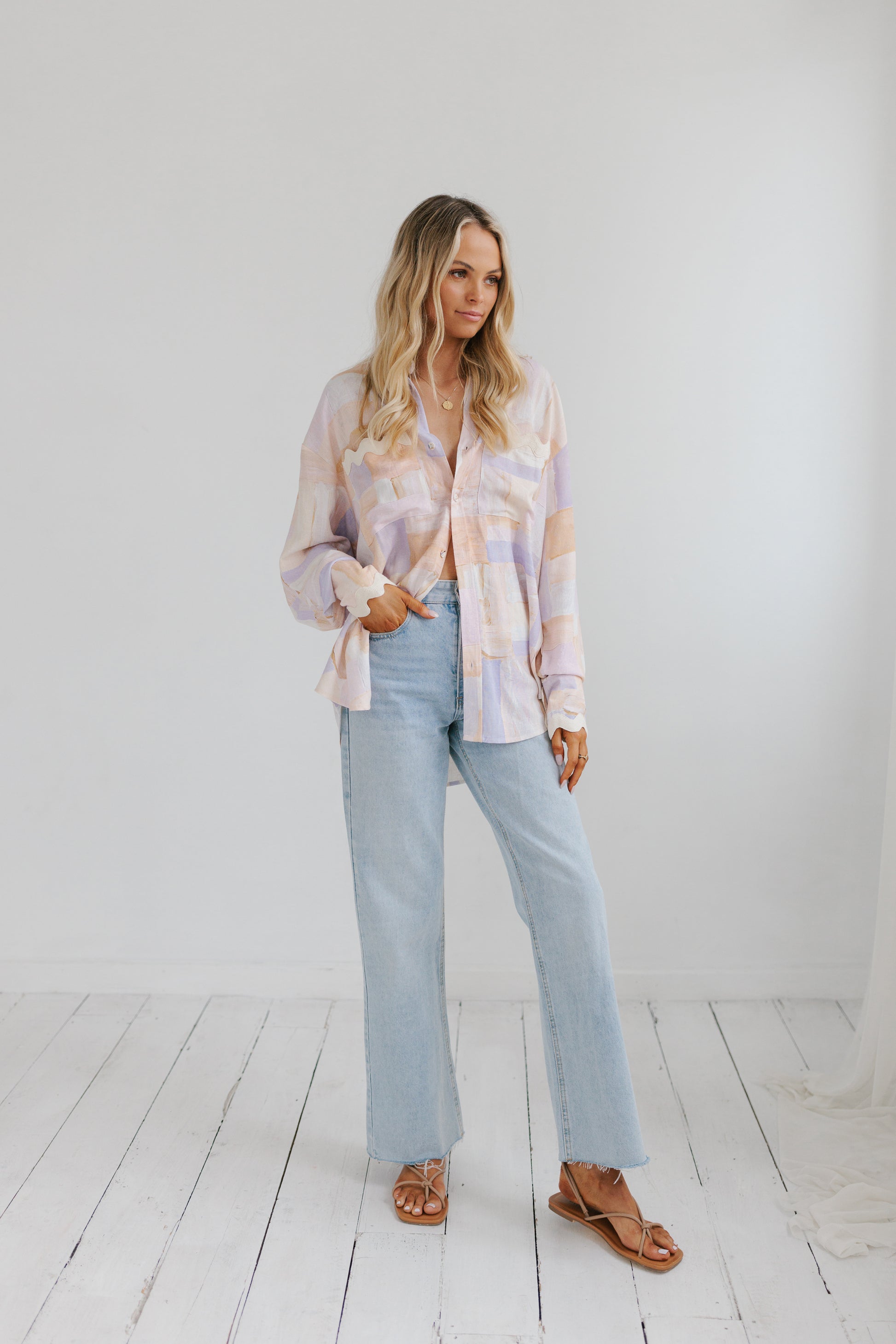 Stunning peach, pink + lilac hued exclusive artist print linen blend shirt