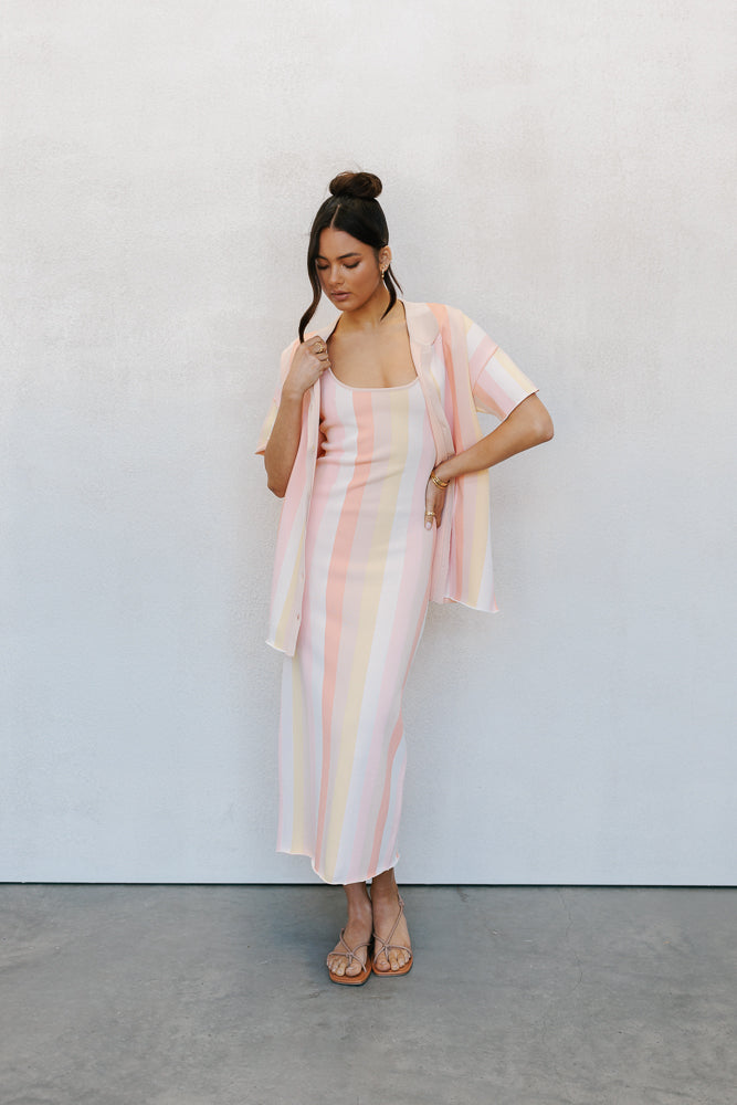 Our Turin Midi Dress by Cinque is a statement in modern style with a playful twist. Featuring a fitted silhouette + sweet sorbet-hued stripes in yellow, melon + beige, this knitted dress combines flattering structure with fresh, fun energy.