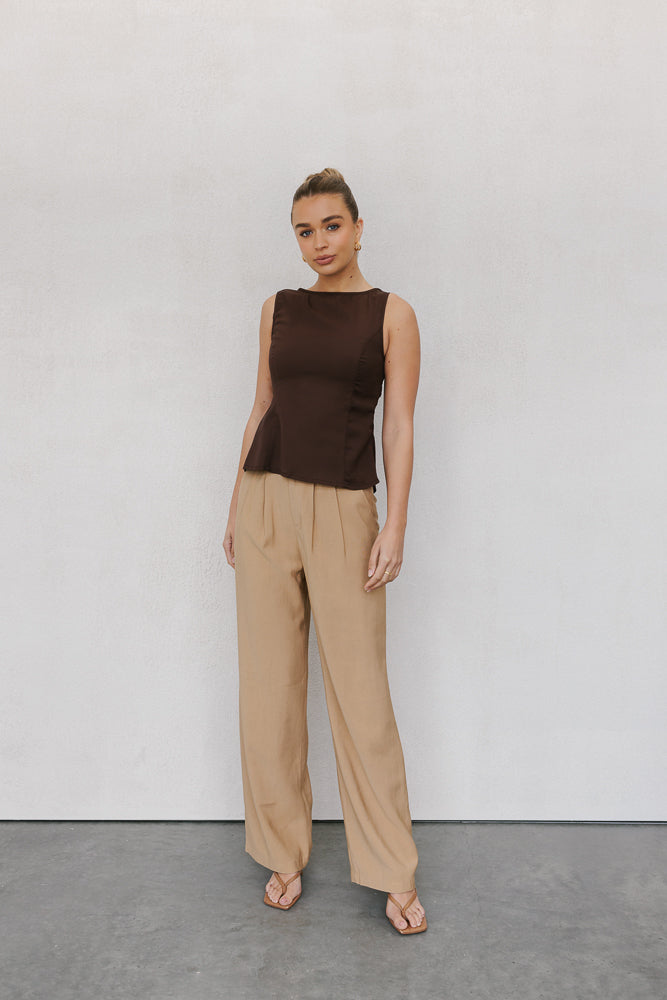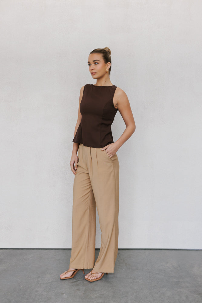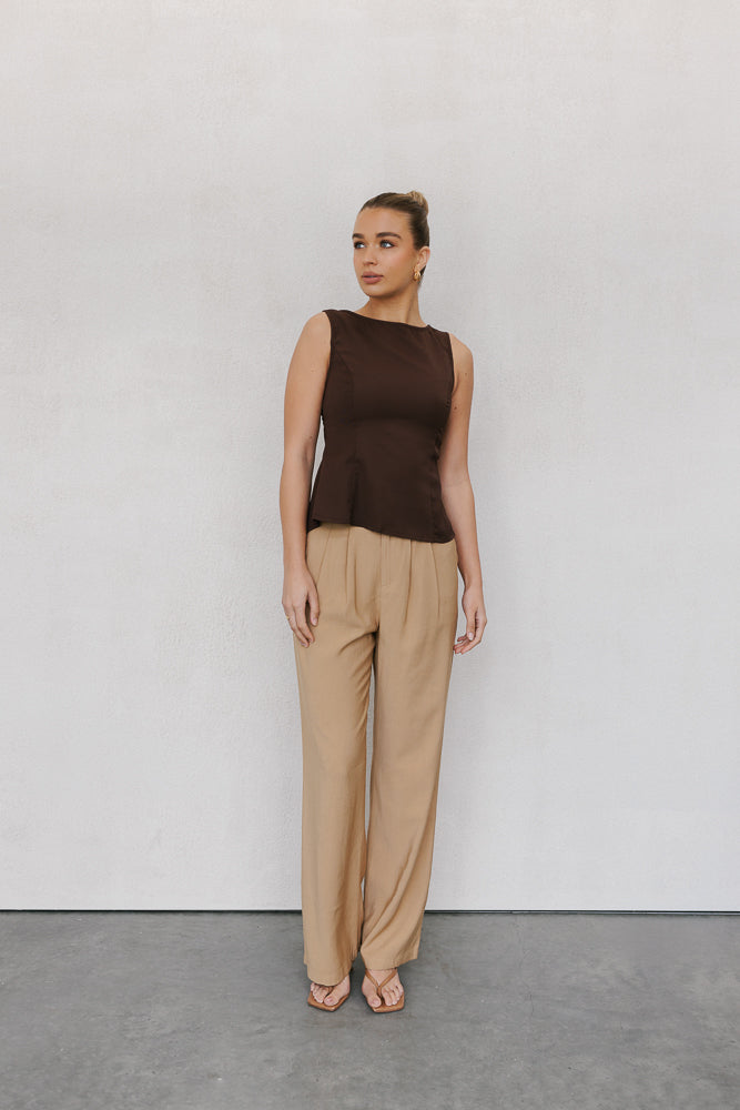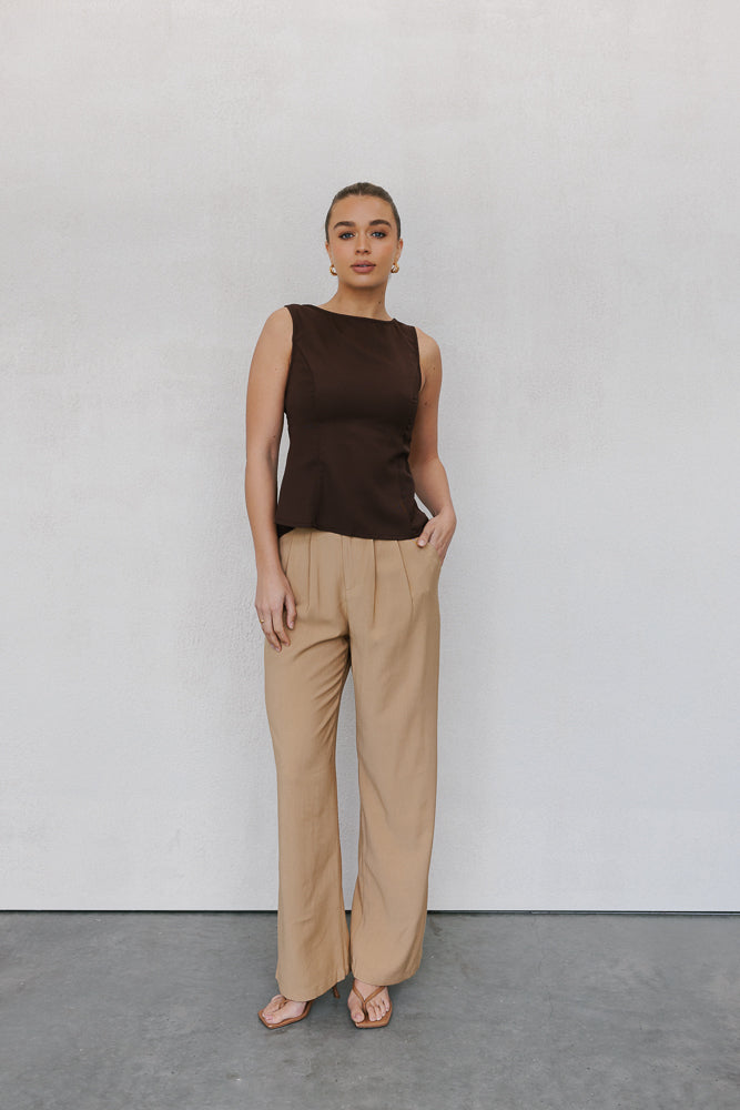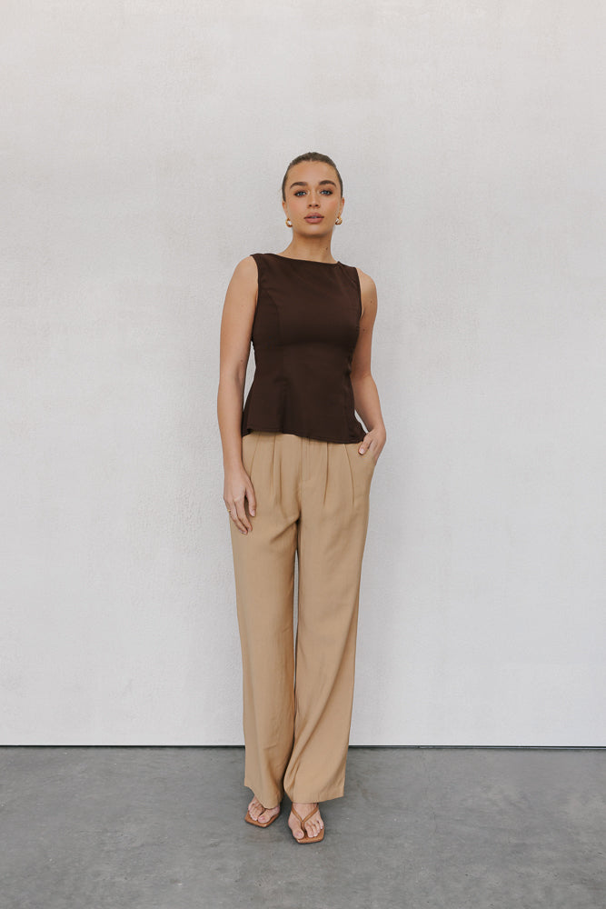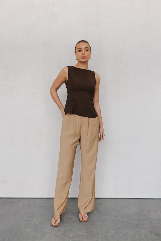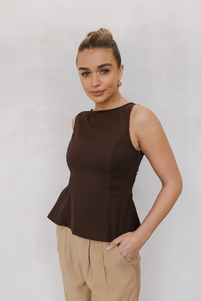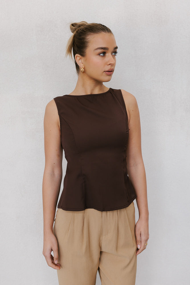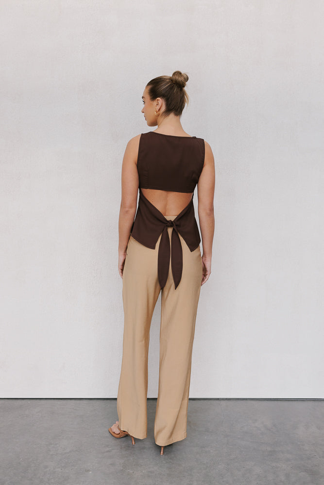 Our Udita Top is a sweet brown top with charming back tie detail. With a round neckline + flattering seam detail to the front, her unique tie detail adds a stylish twist. Udita is a versatile + elegant addition to your wardrobe.