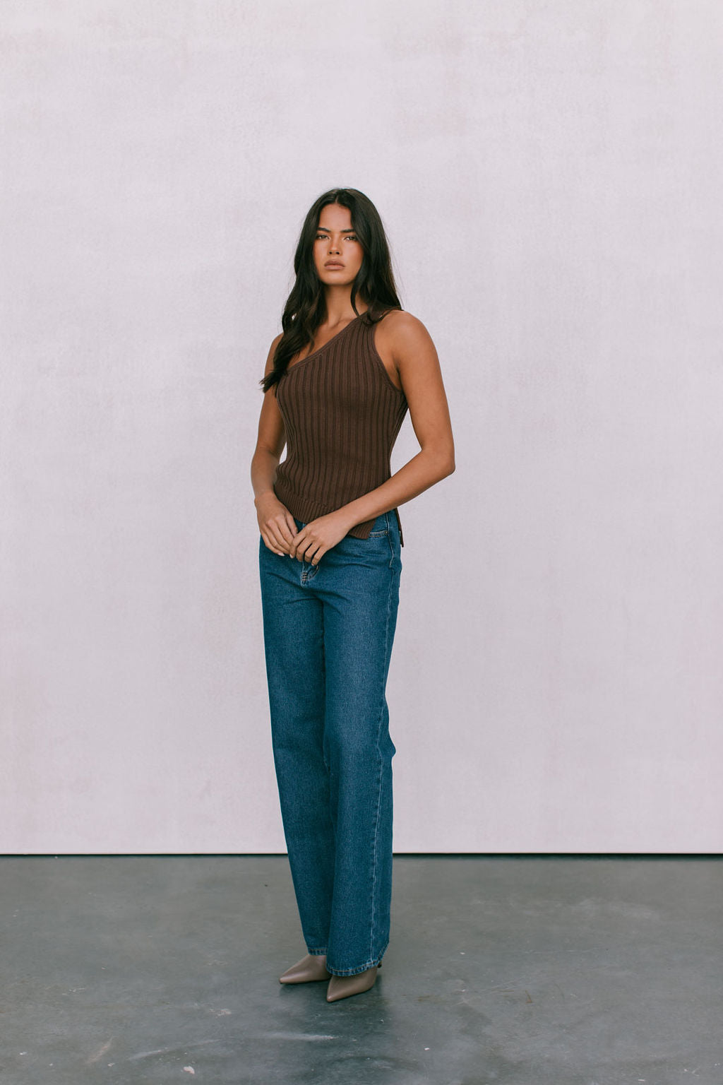Our Uma Knit Top offers a modern take on classic knitwear. Designed in a chocolate brown knit, her asymmetrical shape offers a flattering fit, making it a versatile choice. Style with your fave denim for the ultimate trans-seasonal outfit.