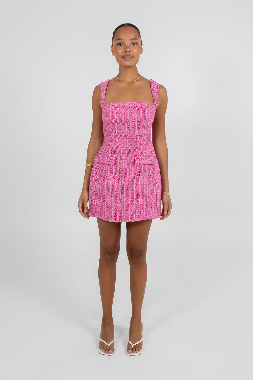 Preppy + polished, our Ursilla Mini Dress is crafted from pink boucle tweed knit in a flattering a-line silhouette. The wide straps, faux pockets + a straight neckline makes her perfect for brunch, parties or date nights.