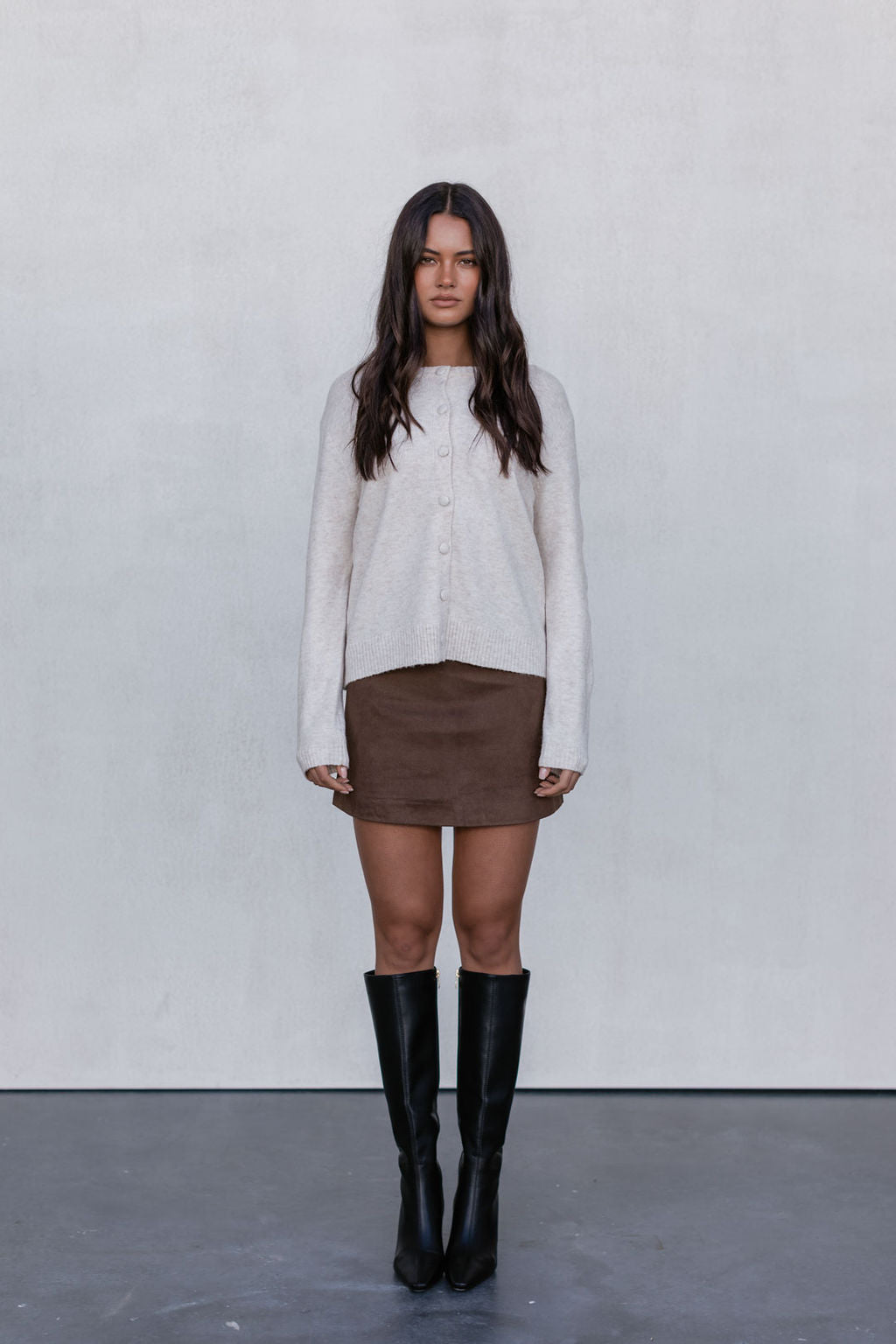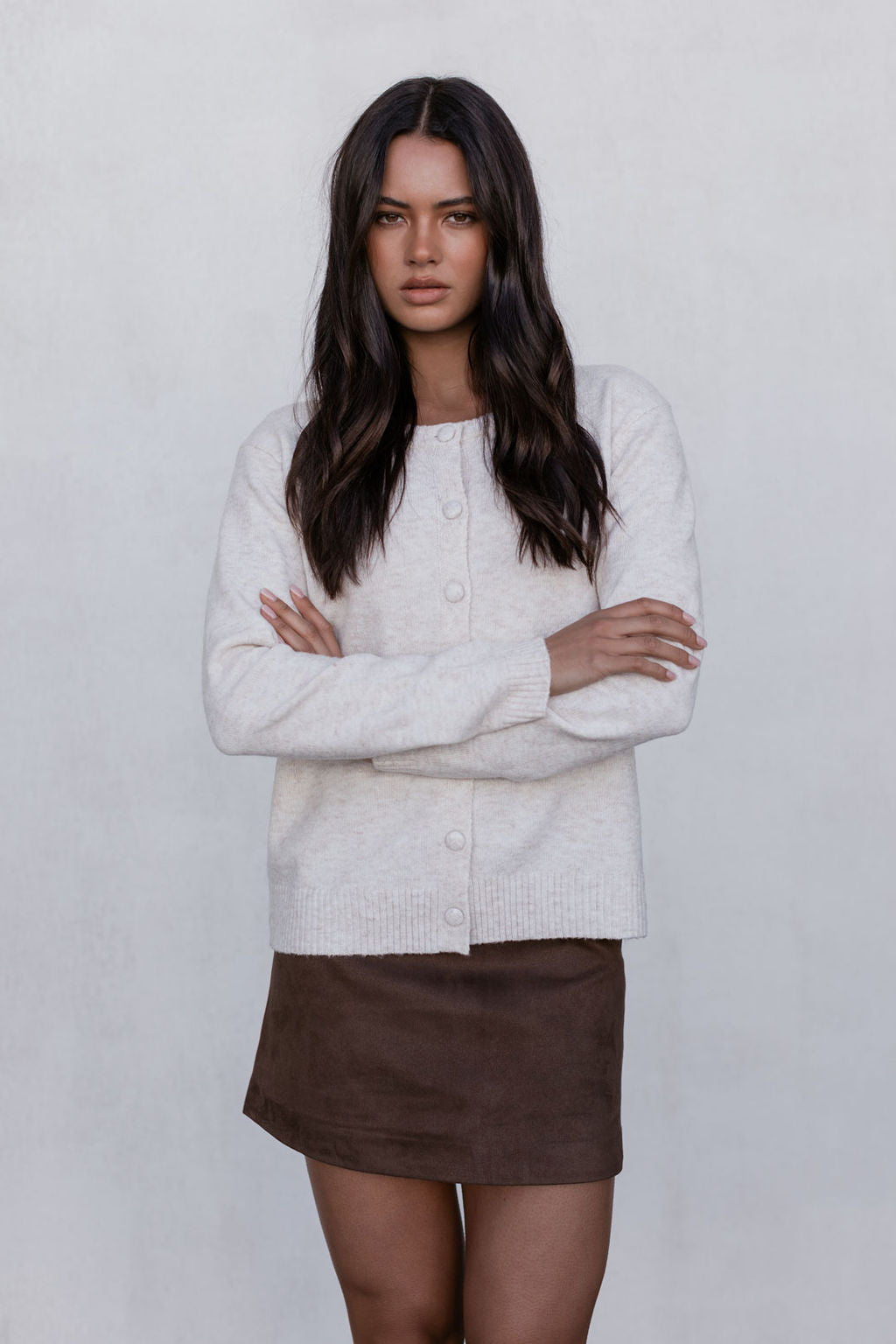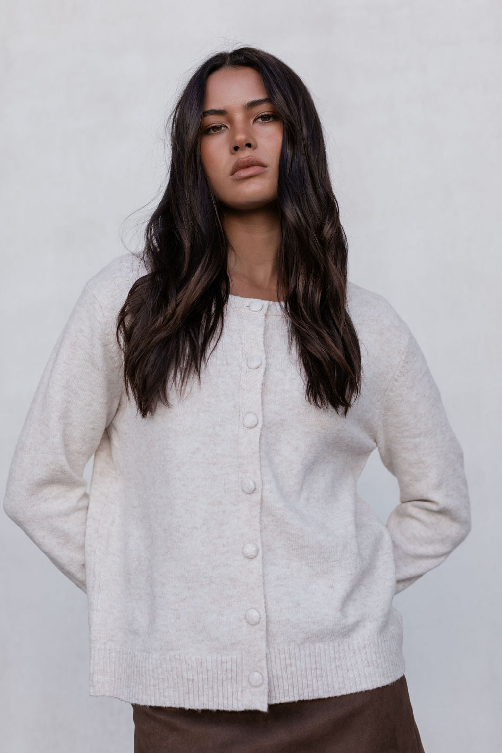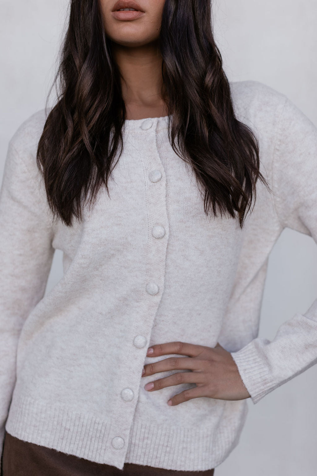 Soft, sweet + effortlessly classic - our Vanessa Knit Cardigan is a wardrobe staple you’ll reach for on repeat. Crafted in a beige marle knit with fabric-covered buttons + a relaxed silhouette, it’s the perfect cosy layer for everyday styling.
