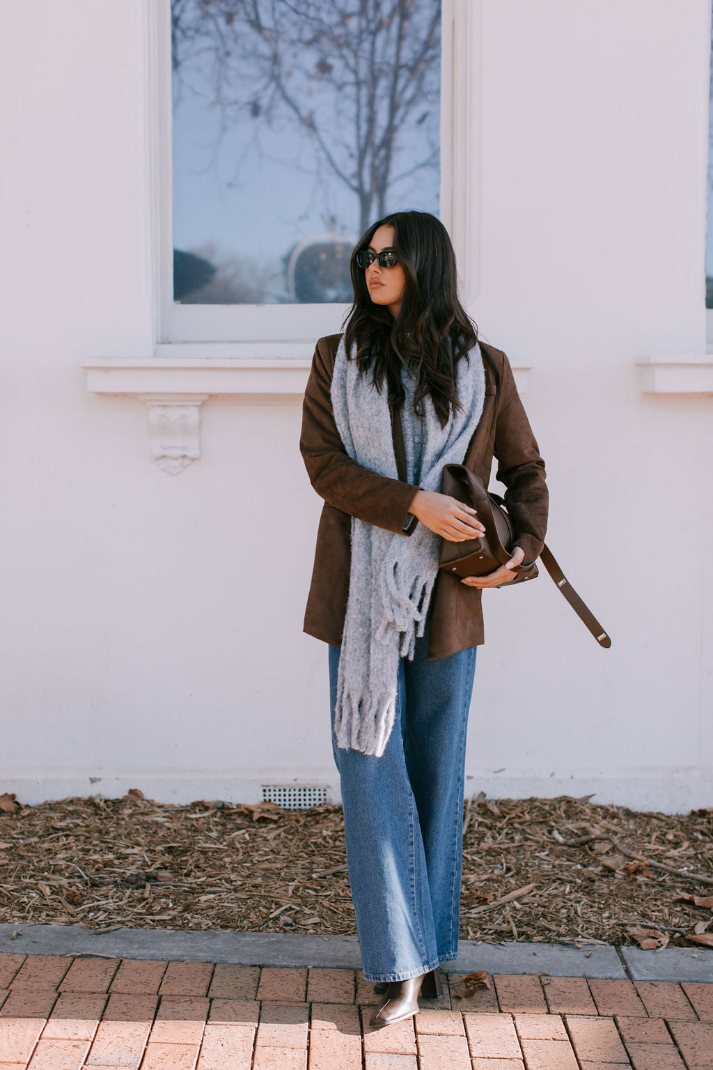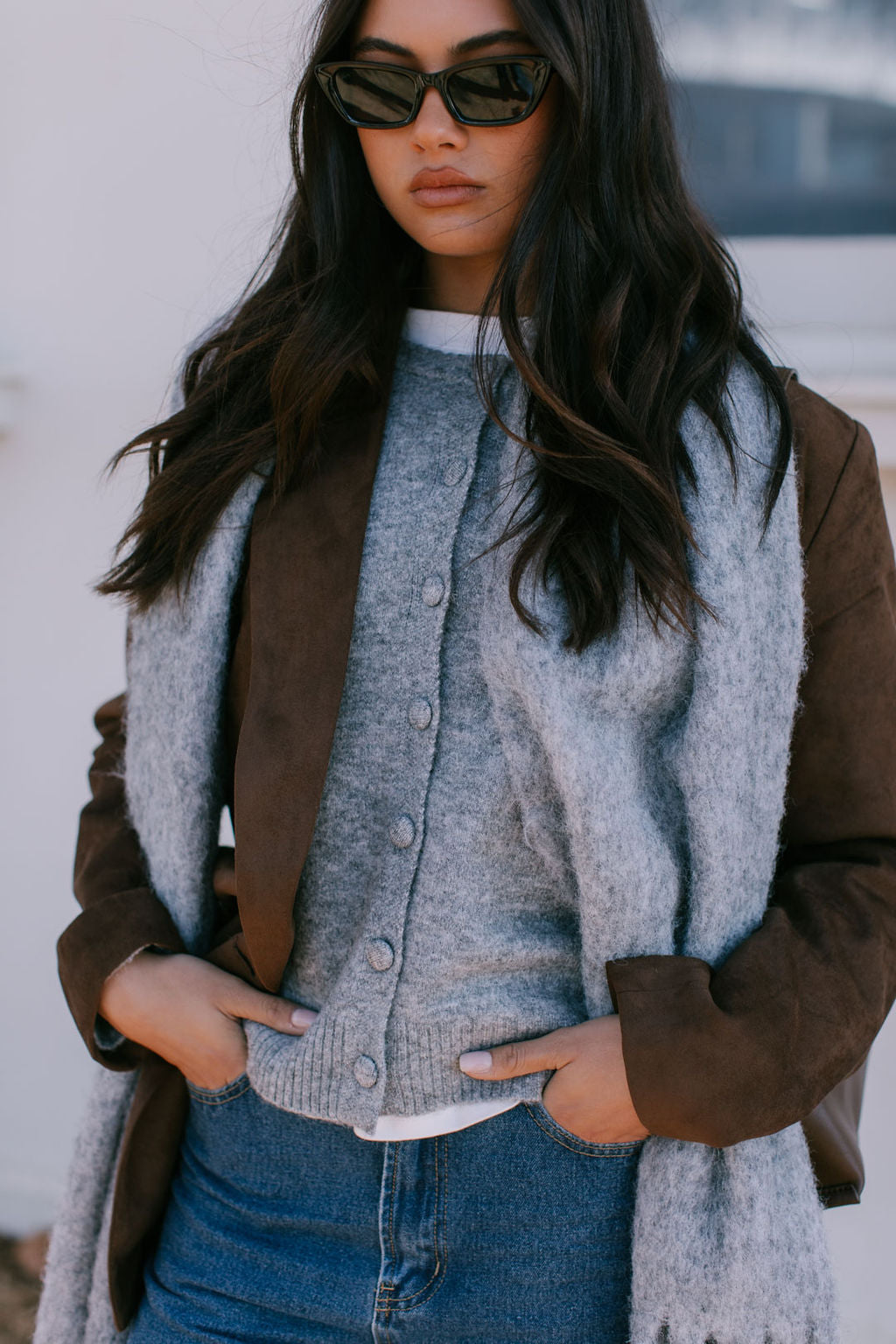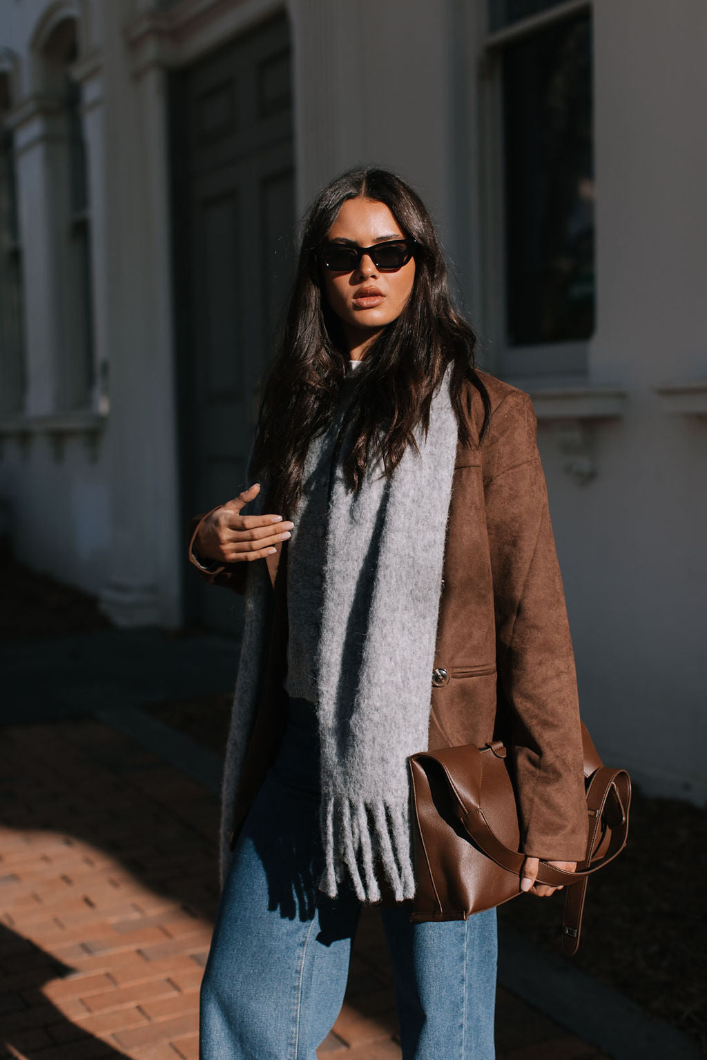On-trend, timeless chocolate brown oversized blazer with a buttery-soft vegan suede finish. Your new go-to for easy, elevated style.